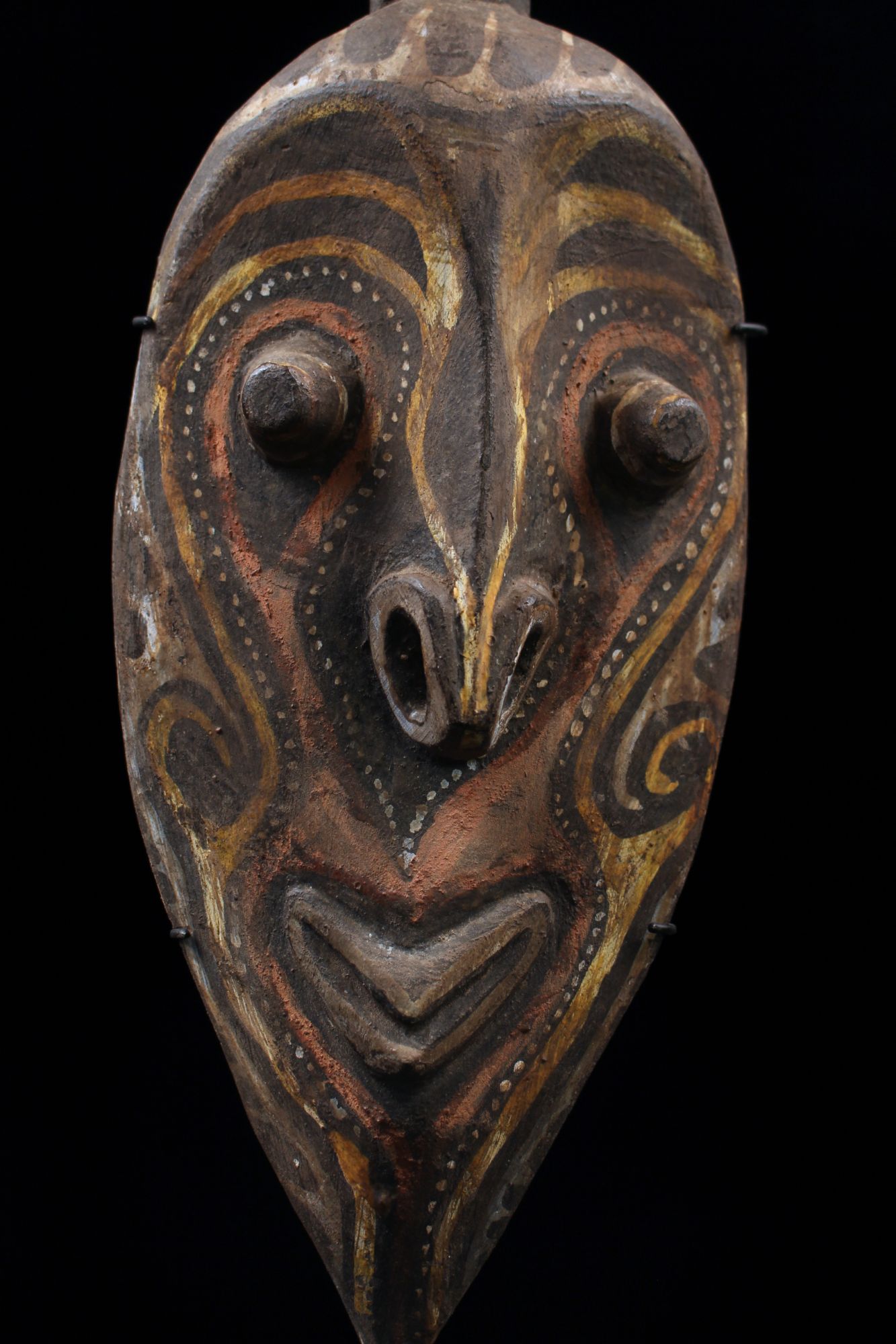 Ancestor mask of the Kwoma ethnic group probably integrating into the family of objects related to the fertility cult celebrated at the yam harvest. Wood, pigments and paints. Sold with a base.