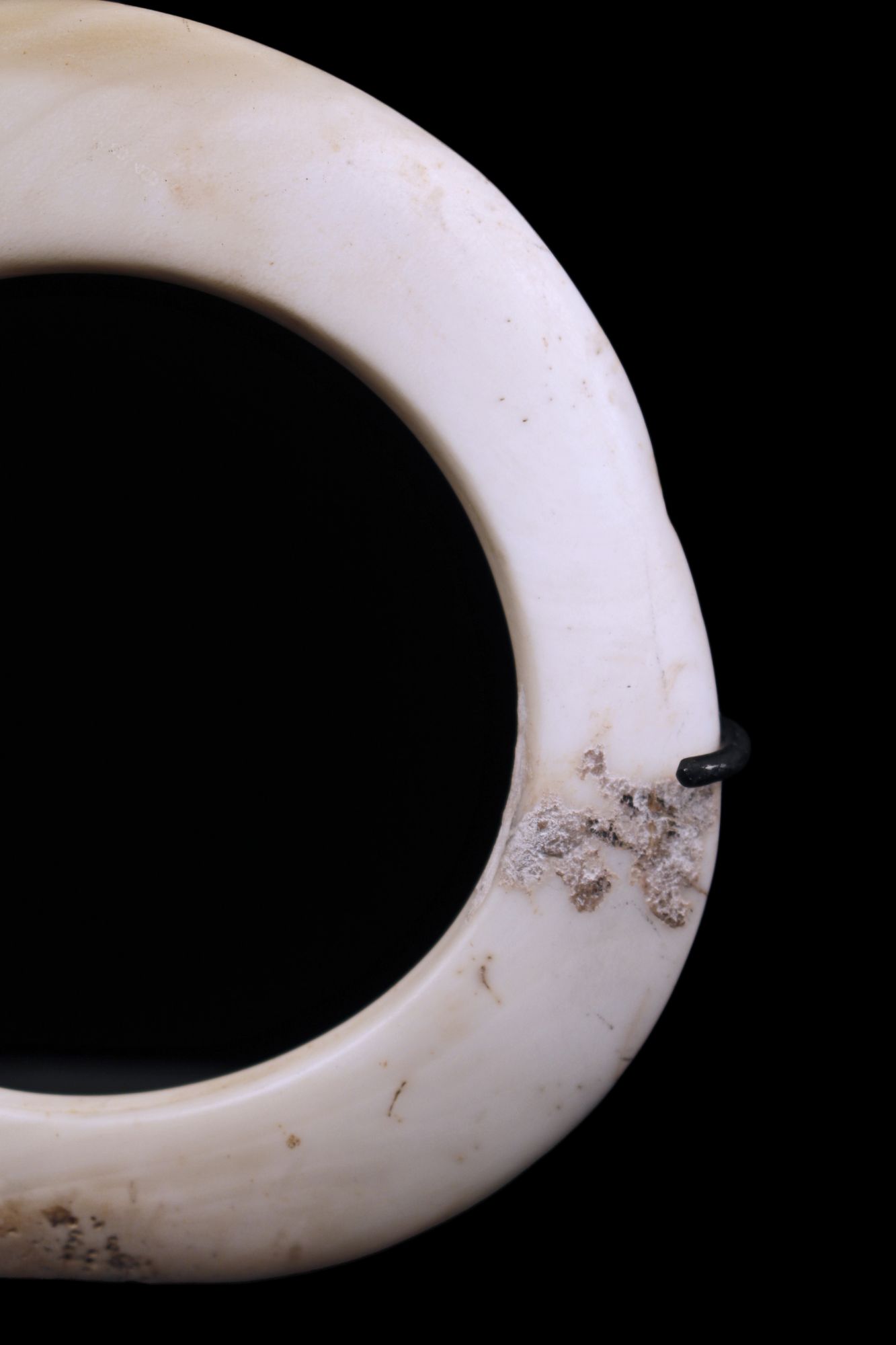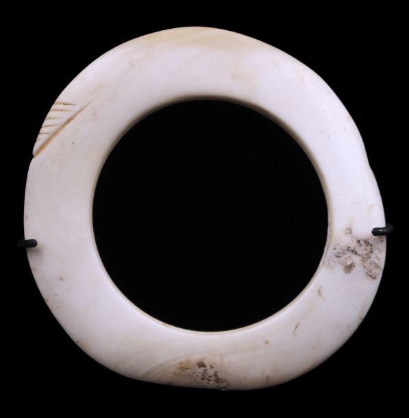 Monnaie d'échange en coquillage (coquillage fossile). Cette monnaie de prestige est échangée lors d'évènements majeurs comme les mariages, réconciliations, échange de terre, compensation etc... Les encoches gravées en partie haute évoquent un bec de Calao. Exposée et vendue avec un socle.