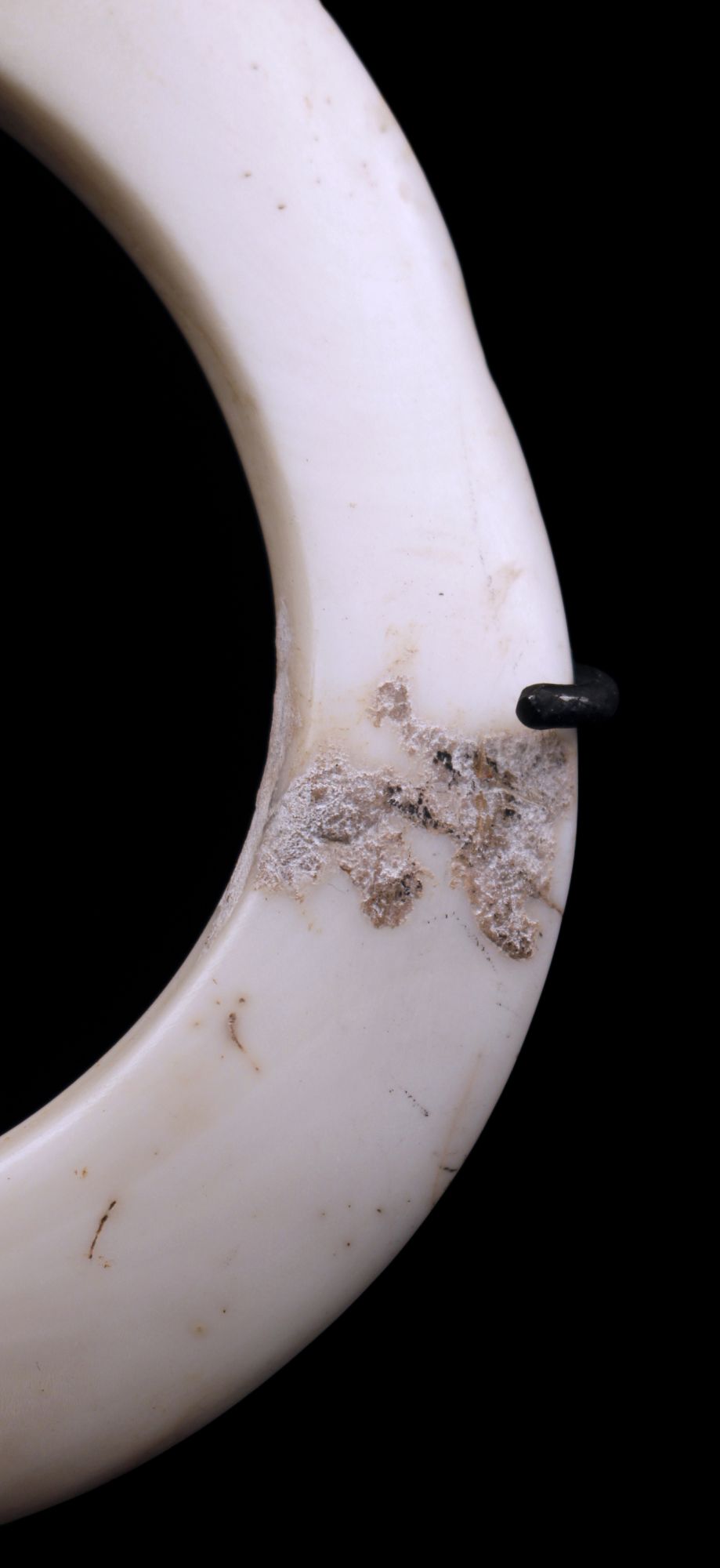 Shell currency (fossil shell). This prestigious currency is exchanged during major events such as weddings, reconciliations, land exchange, compensation etc... The notches engraved in the upper part evoke a beak of hornbill bird. Exposed and sold with a base.