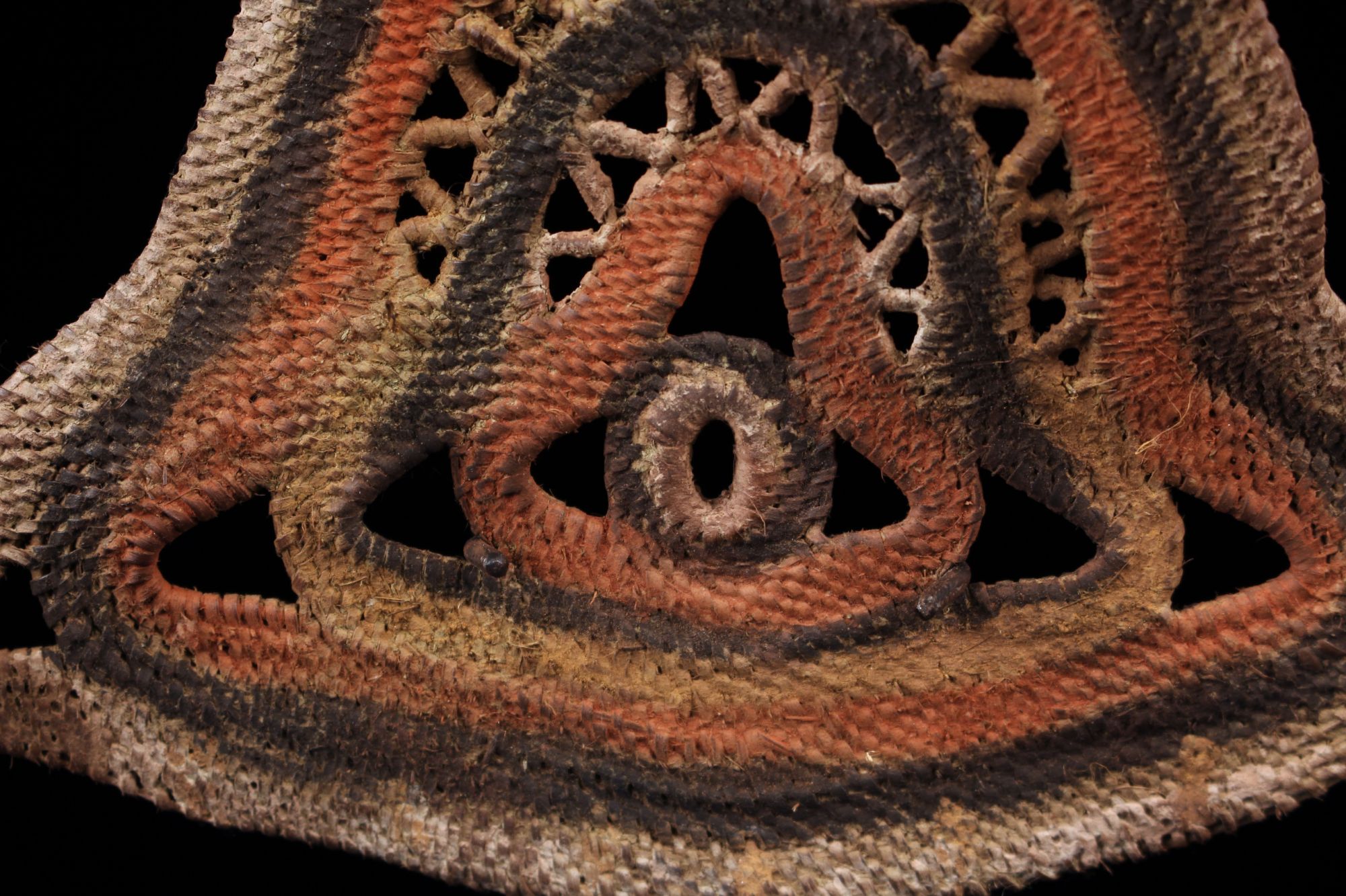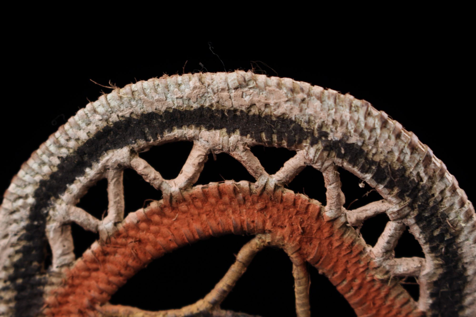 A small basketry ornament used during traditional ceremonies during the yam harvest period in the Maprik area (Ethnie Abelam). This type of headdress is used to dress the most beautiful tubers. Rush and natural pigments. Sold with a stand.
