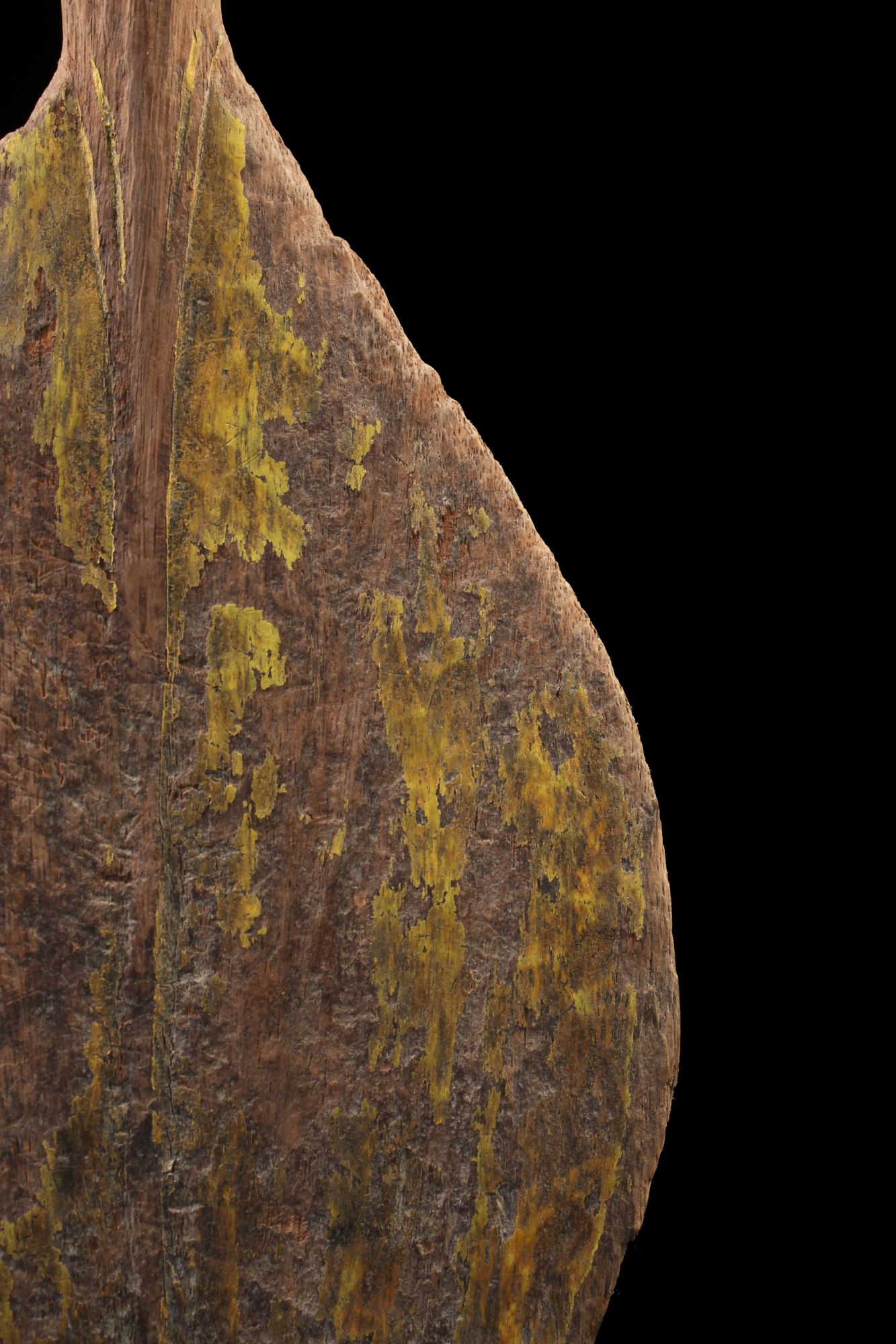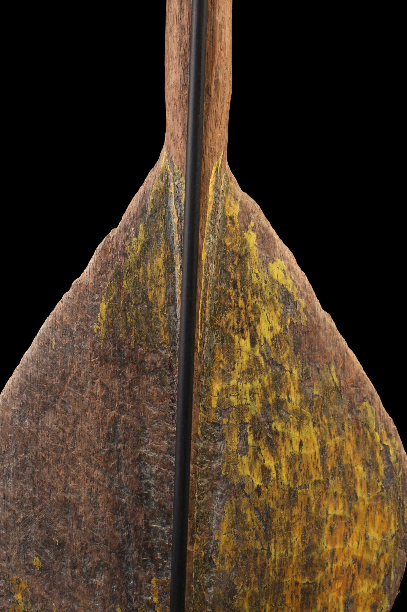 Ancienne pagaie à l'extrémité sculptée. Chaque clan de chaque village de la région du fleuve Sépik rend distinctes ses pagaies par les symboles représentés sur le manche. Bois avec belle patine d'usage et restes de peinture jaune. Vendue avec un socle de présentation.