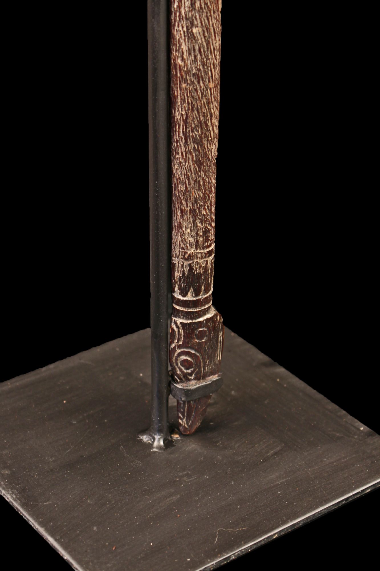 Small child's paddle with a carved top. Every clan from every village of Sepik river area shows on the top its own designs in order to recognize them. These symbols are trees, leaves, birds, insects etc. Evocation here of the praying mantis, the totemic insect of the clan of origin. Wood with beautiful used patina... Sold with a custom base. Pictures from David & Amélie Godreuil.