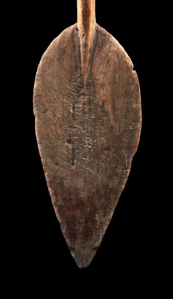 Pagaie de rivière. La pirogue reste le moyen de locomotion le plus usité dans la vallée du fleuve Sépik en Papouasie Nouvelle Guinée. Bois avec belle patine d'usage... Vendue avec un socle de présentation. Photos David & Amélie Godreuil.