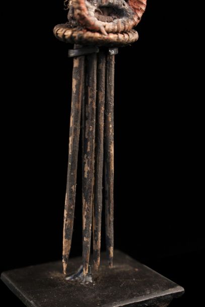 Rare peigne Abelam ayant la fonction d'orner les cheveux comme un bijou. Présence d'un petit visage stylisé. Jonc tressé, bois, plumes, résine et pigments naturels. Vendu avec un socle. Traces d'usage.