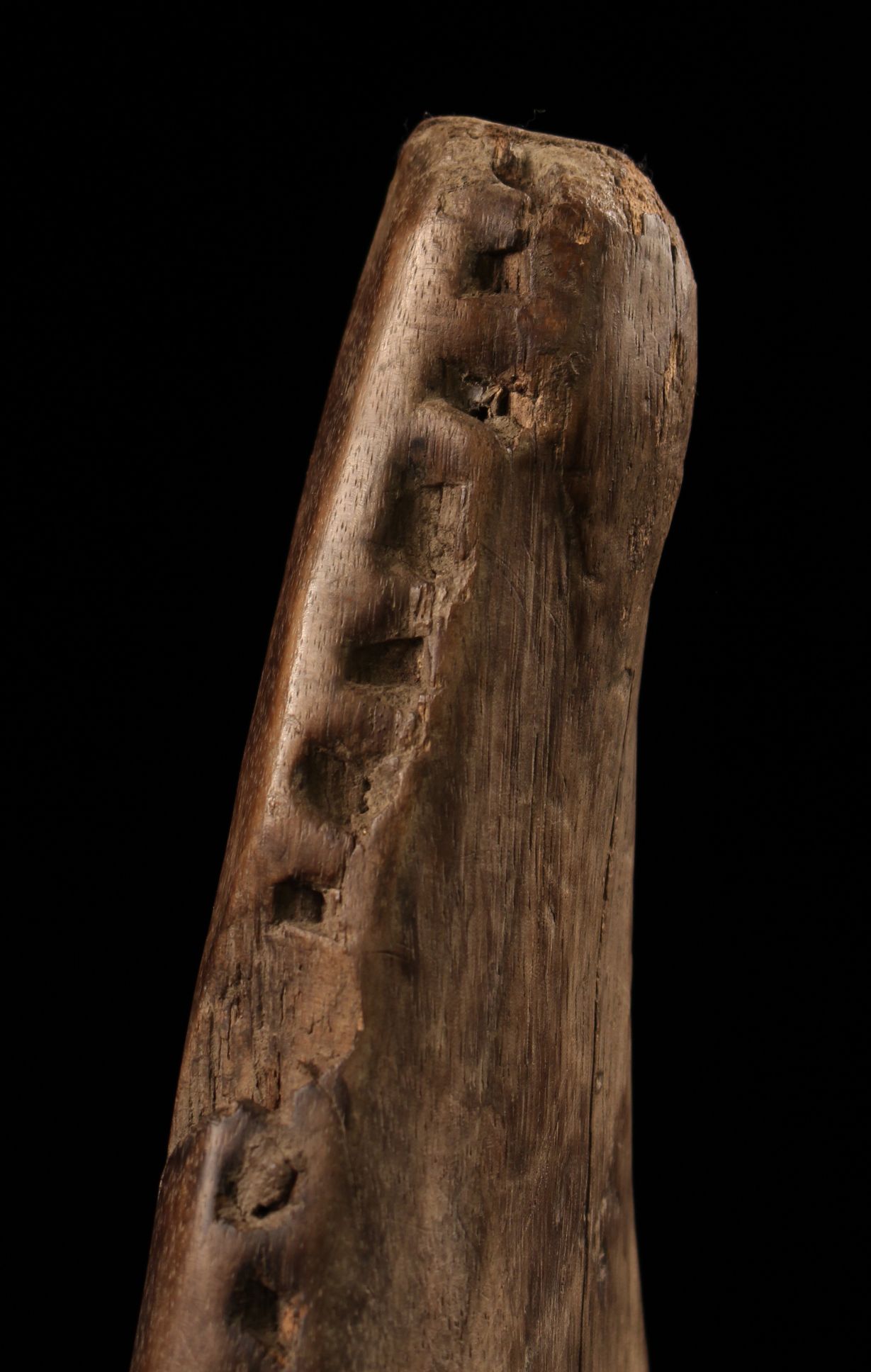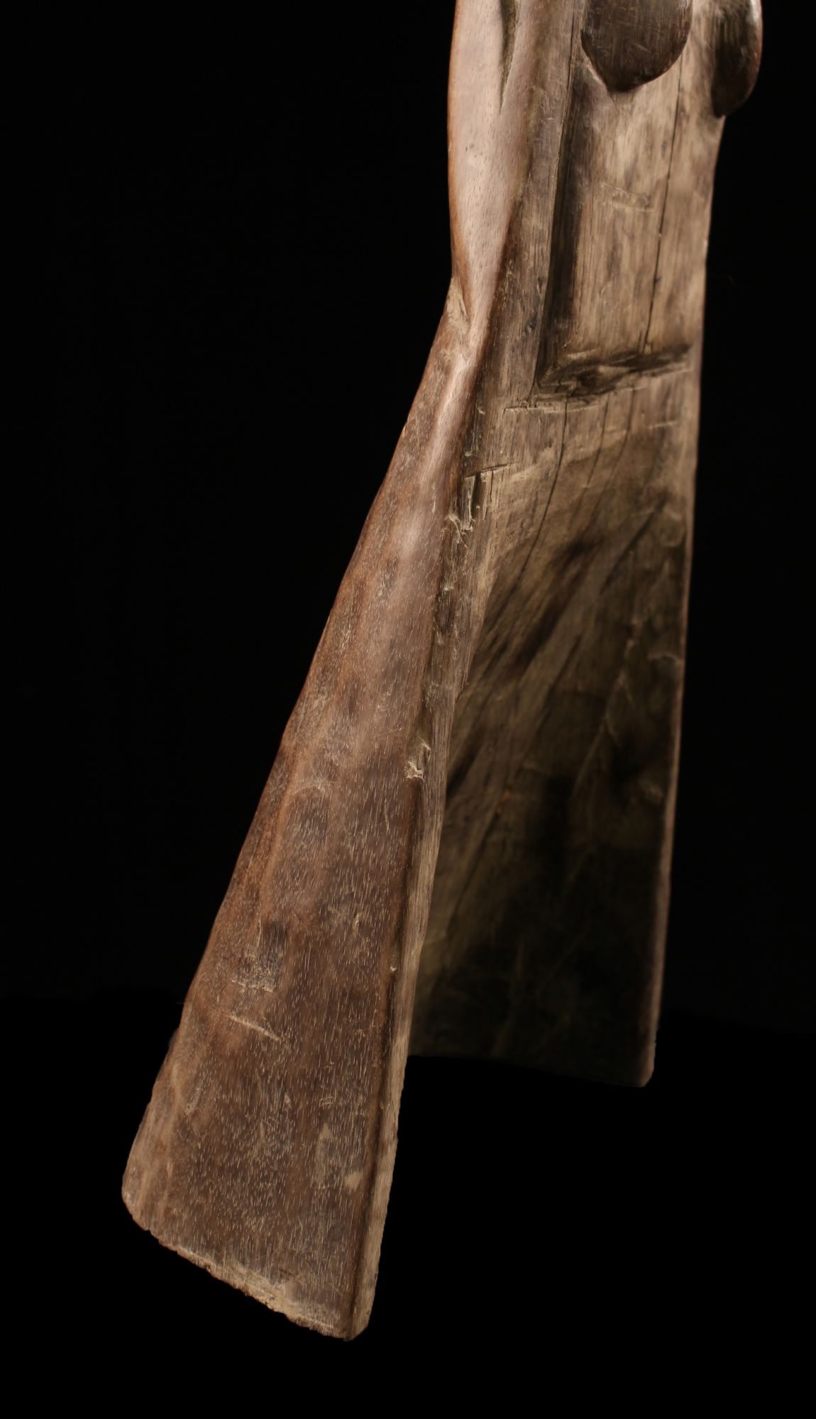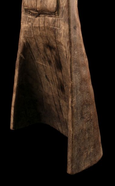 Proue de pirogue en forme de tête de crocodile. Belle patine d'usage. La pirogue reste de nos jours le moyen de locomotion le plus usité dans la vallée du fleuve Sépik. La plupart de ces pirogues utilisées dans les régions du bas et moyen Sépik ont une proue sculptée représentant ainsi une tête de crocodile, animal craint et vénéré. Bois. Traces d'usage.