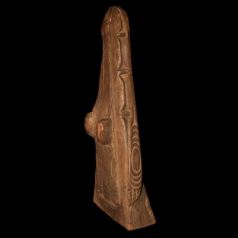 Belle proue de pirogue en forme de tête de crocodile. Belle patine d'usage. La pirogue reste de nos jours le moyen de locomotion le plus usité dans la vallée du fleuve Sépik. La plupart de ces pirogues utilisées dans les régions du bas et moyen Sépik ont une proue sculptée représentant ainsi une tête de crocodile, animal craint et vénéré. Bois. Pièce métallique clouée en guise de restauration. Montée sur plaque.