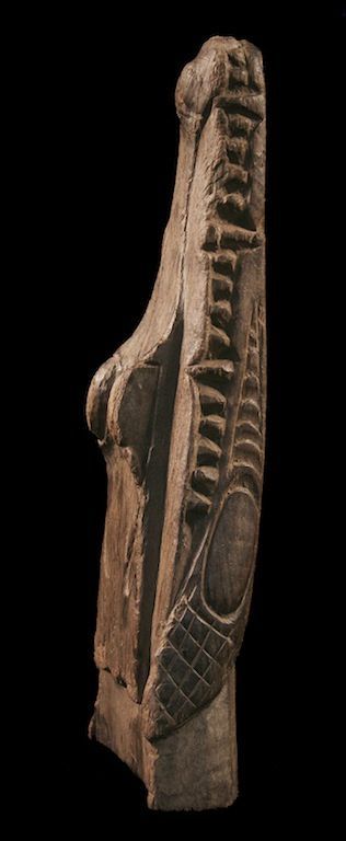 Ancienne proue de pirogue en forme de tête de crocodile avec patine d'usage. La pirogue reste de nos jours le moyen de locomotion le plus usité dans la vallée du fleuve Sépik. La plupart de ces pirogues utilisées dans les régions du bas et moyen Sépik ont une proue sculptée représentant ainsi une tête de crocodile, animal craint et vénéré. Bois. Possibilité de soclage sur demande (20 euros en sus).