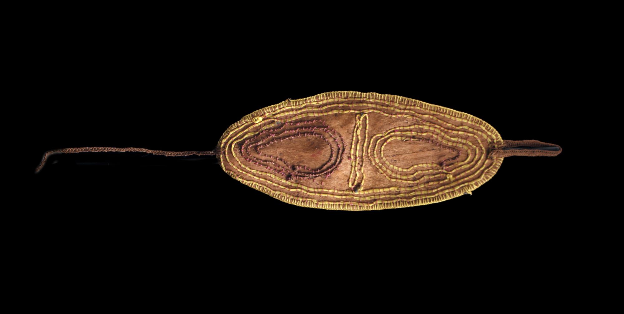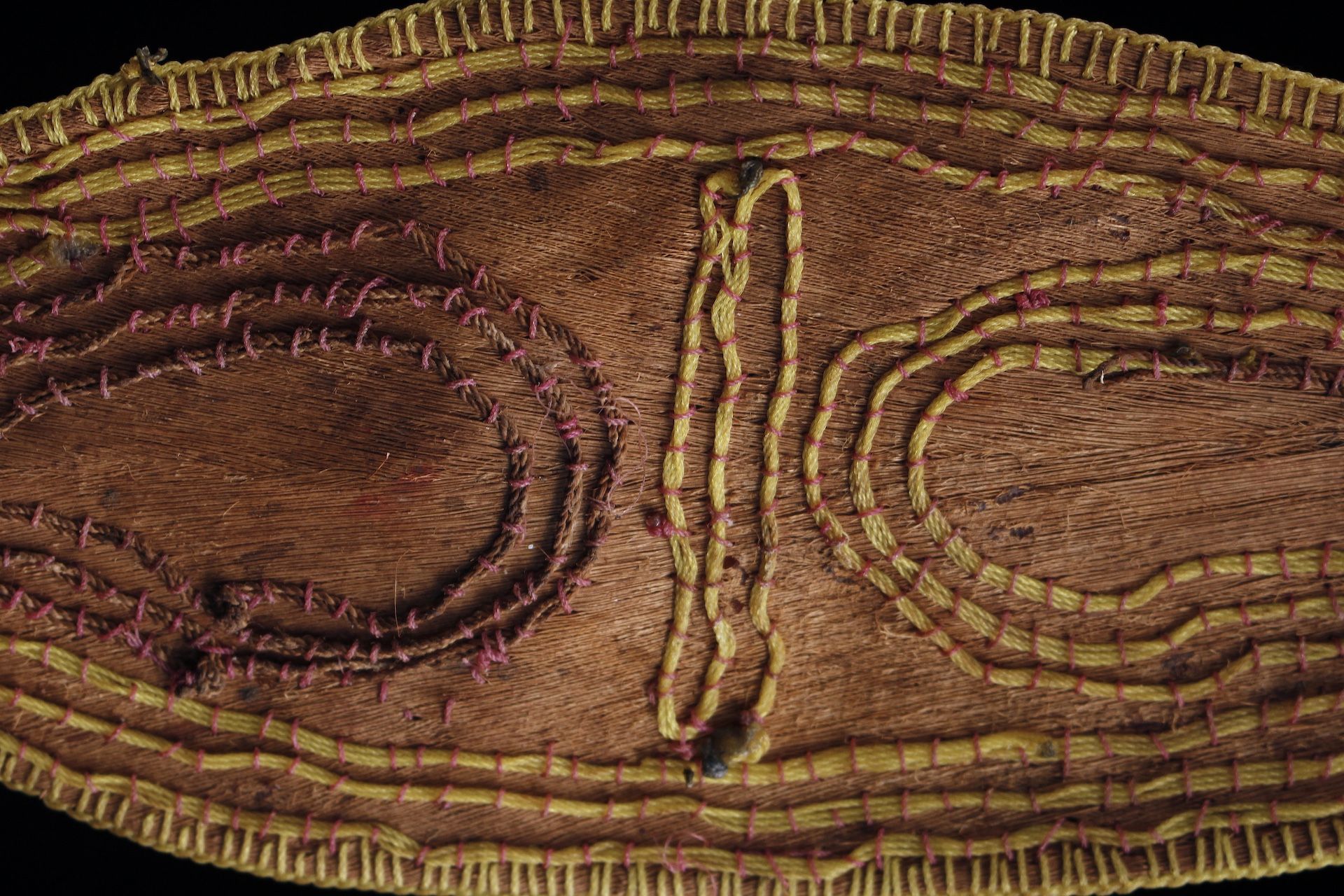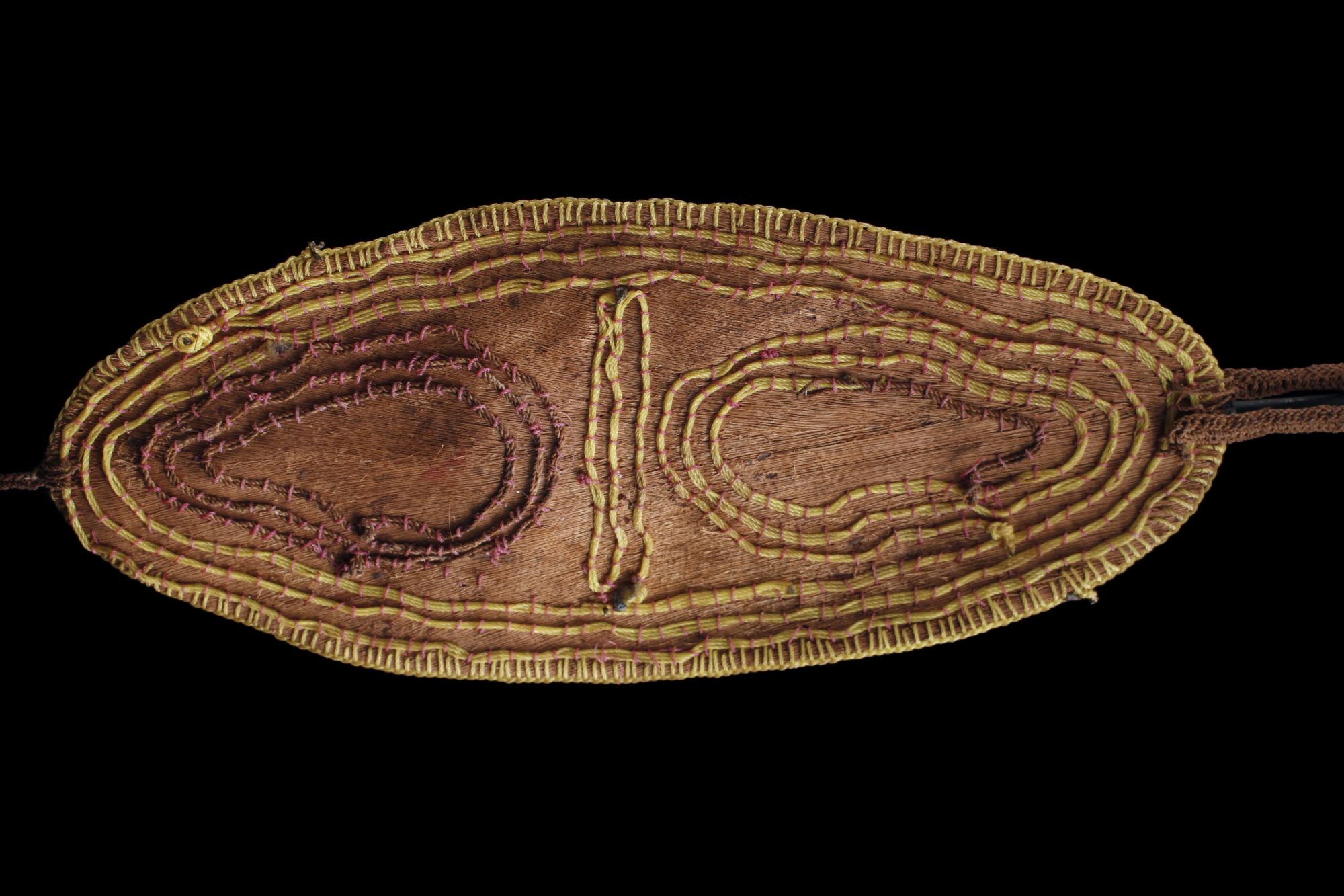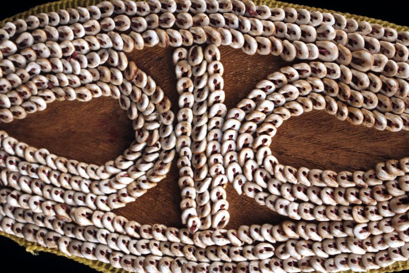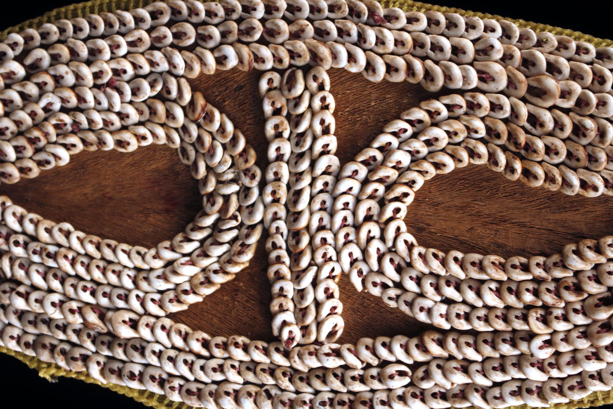 Parure frontale collectée dans la région des Hauts plateaux en Papouasie Nouvelle Guinée. Ce type d'ornement corporel est un élément constitutif des coiffes exhibées lors des cérémonies traditionnelles. Cet objet, très ethnographique, est un savant mélange de savoirs faire complexes. Ecorce battue de banian, partie avant de coquillages de type Nassarius cousus, cordon en fibres naturelles et fils en nylon de récupération. Socle sur demande uniquement. Photo de terrain de David Godreuil.