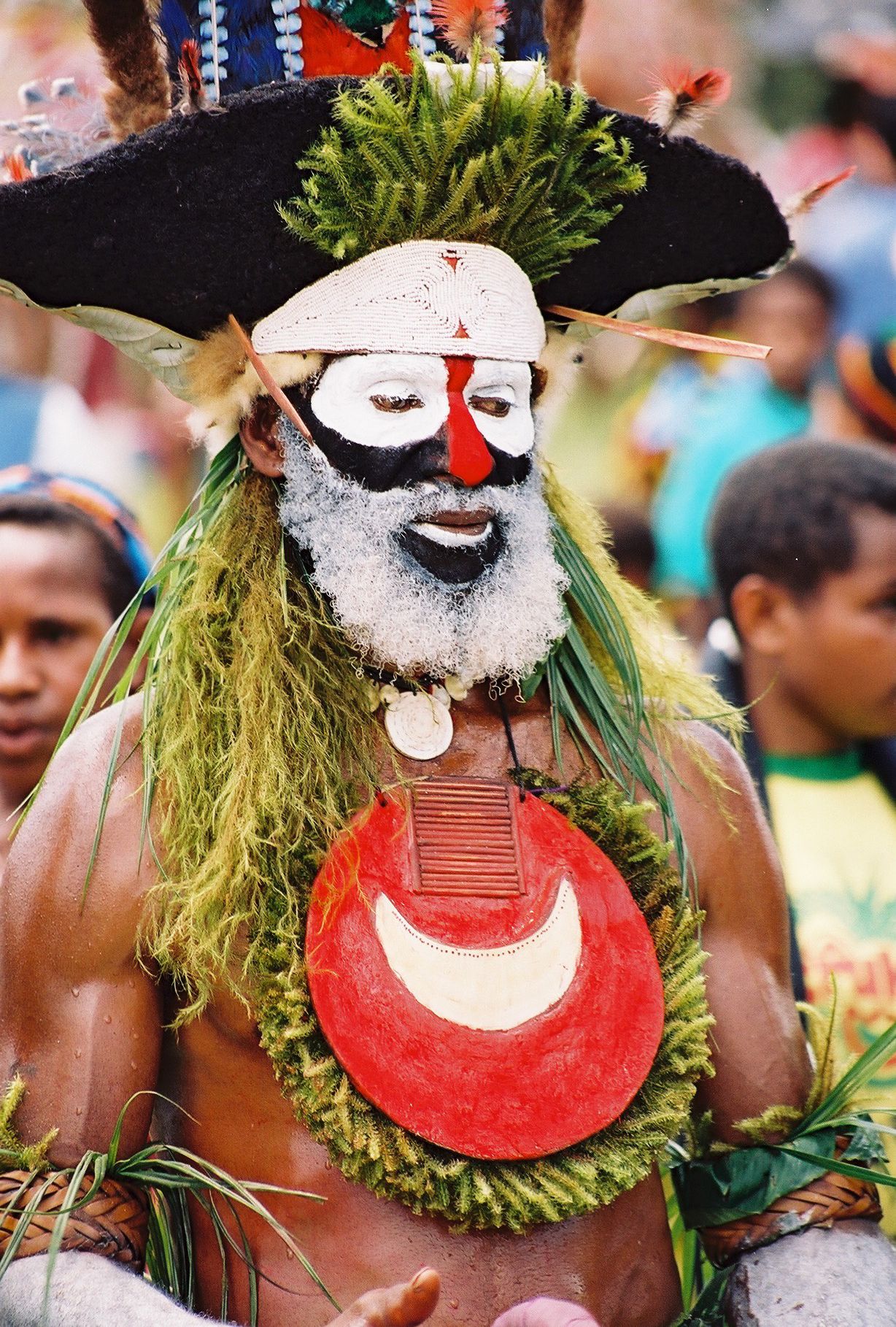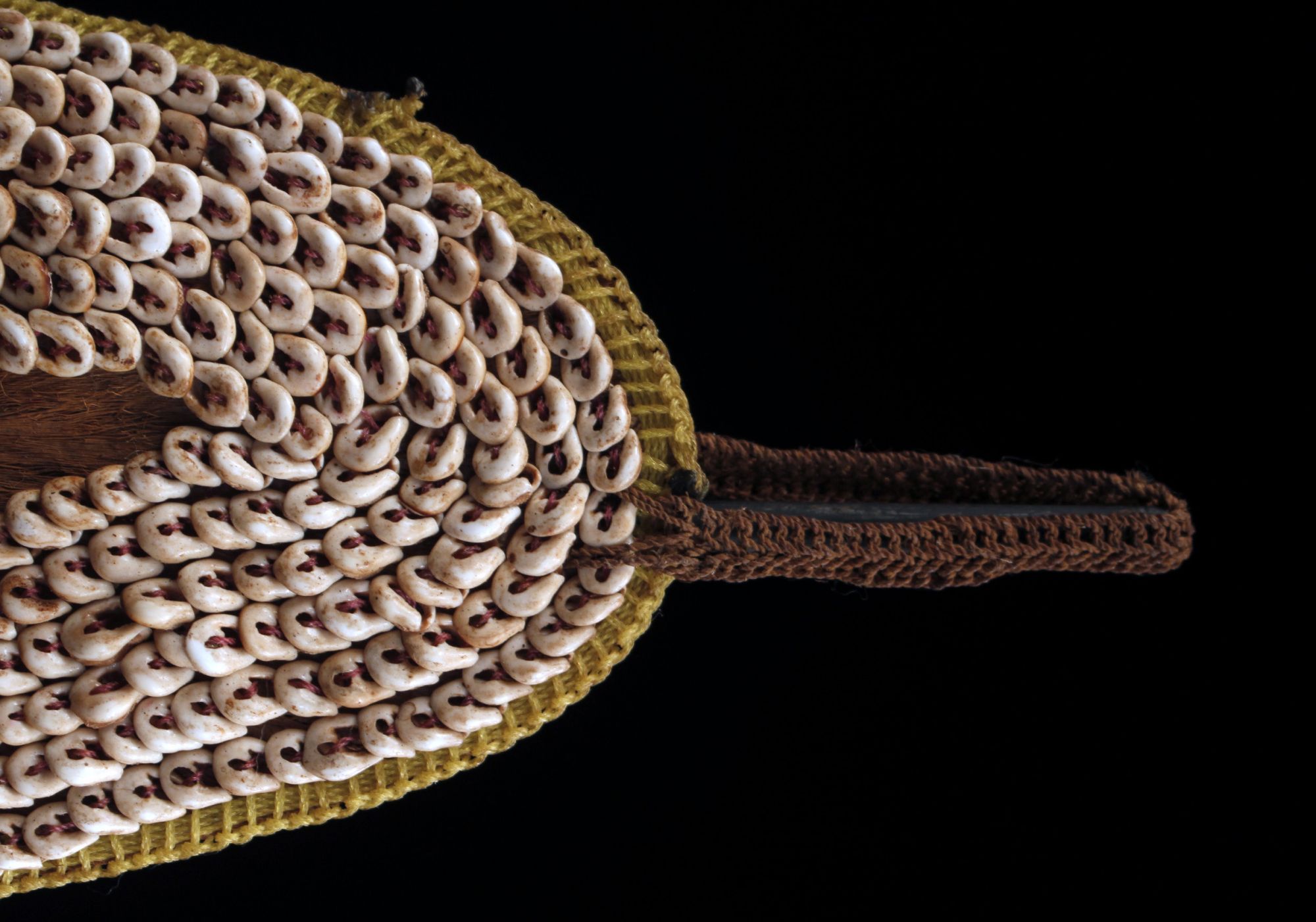Frontal adornment collected in the highlands in Papua New Guinea. This type of body ornament is made part of the headdresses displayed during traditional ceremonies. This highly ethnographic object is a skilful blend of complex craftsmanship. Beaten banyan bark, front part of Nassarius-type shells sewn together, cord made of natural fibers and recycled nylon thread. Base available on request only. Field picture from David Godreuil.