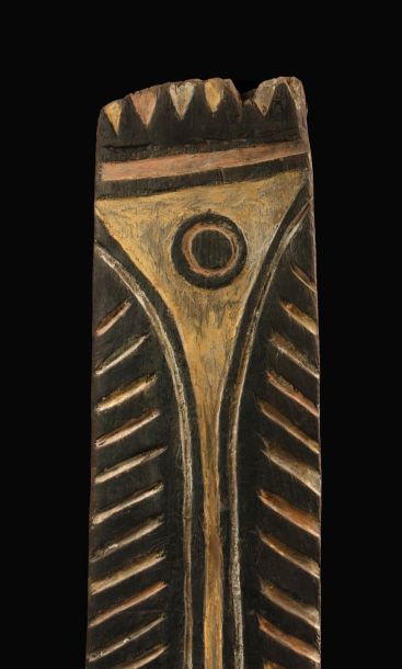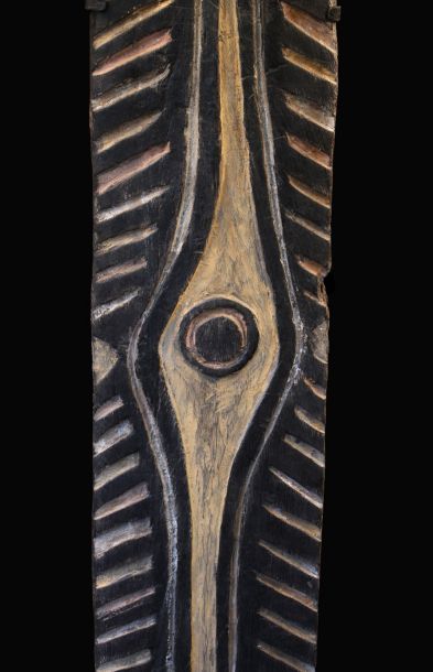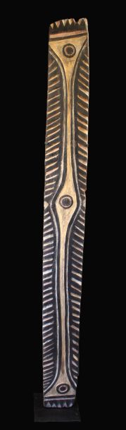 Très belle planche votive en bois et pigments naturels provenant d'une maison de cérémonies. Ces planches, placées dans la maison des hommes, montrent des dessins qui sont la représentation abstraite d'ancêtres ou d'éléments naturels (animaux et plantes totémiques, lune, soleil, étoiles, etc.). Ce sont de véritables tableaux artistiques dont les symboles sont une écriture à part entière... Traces et manques d'usage. Vendue avec un socle.