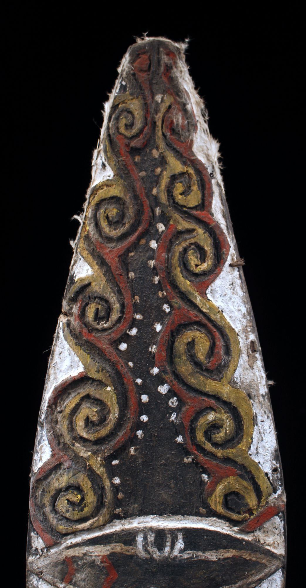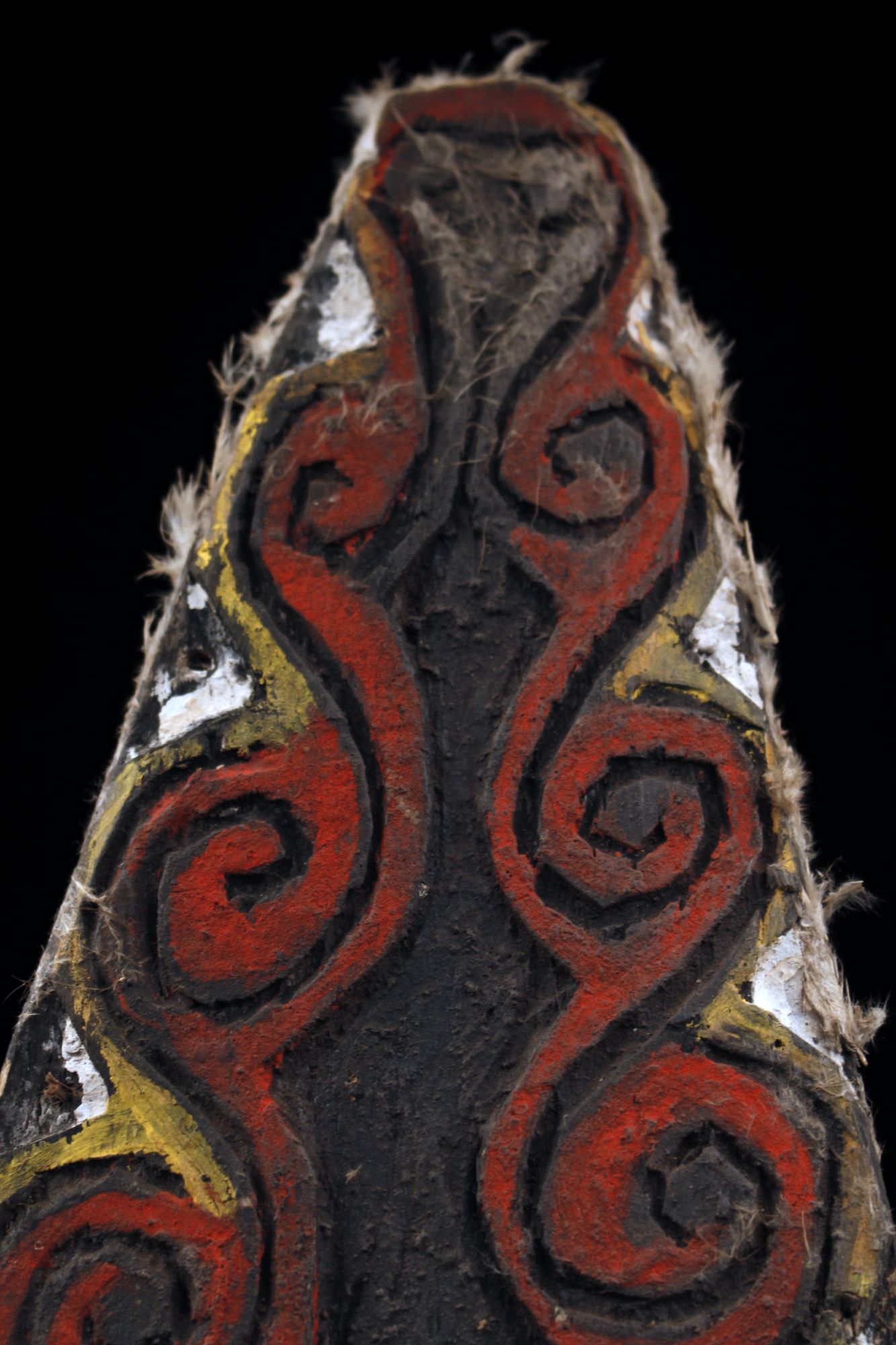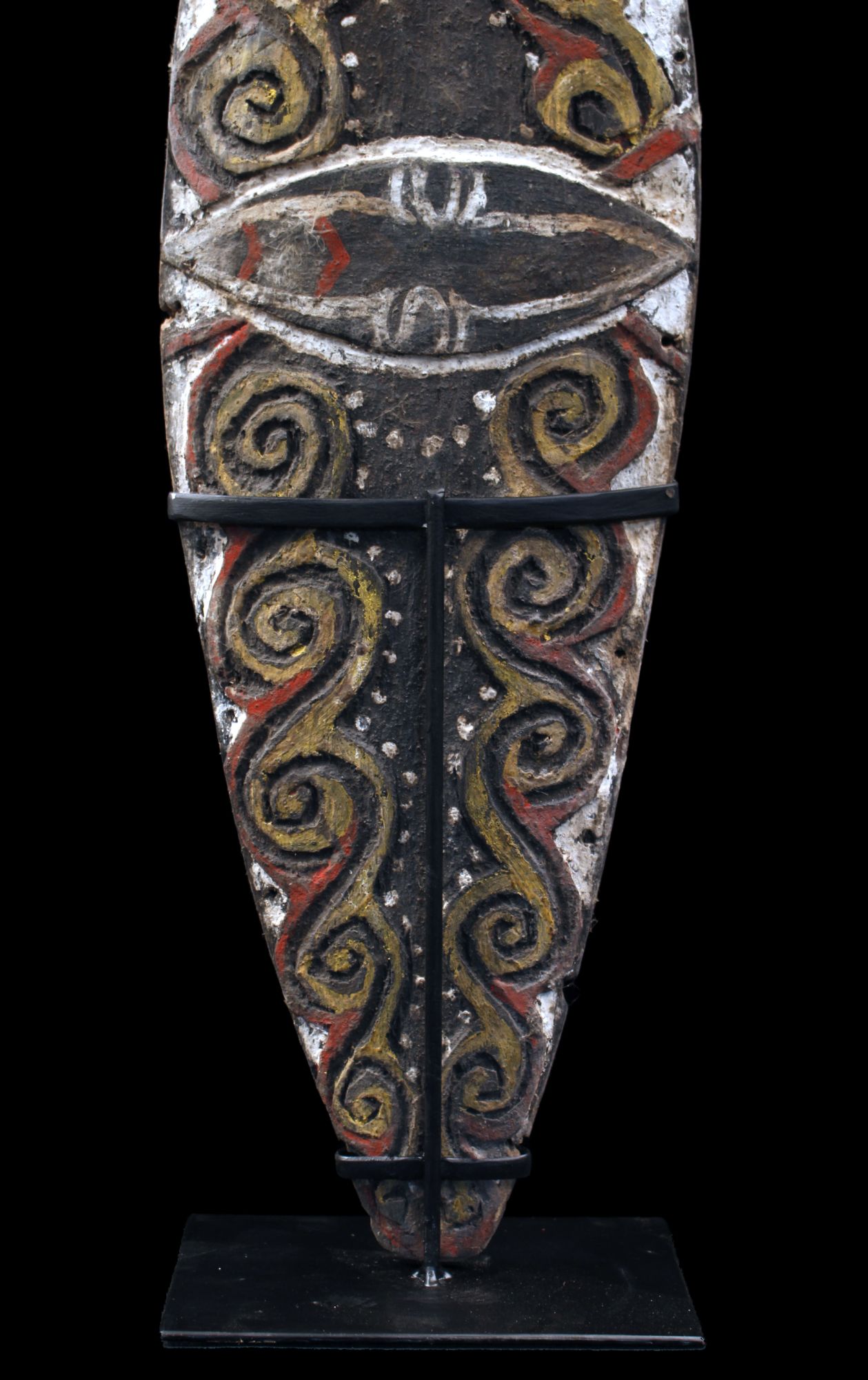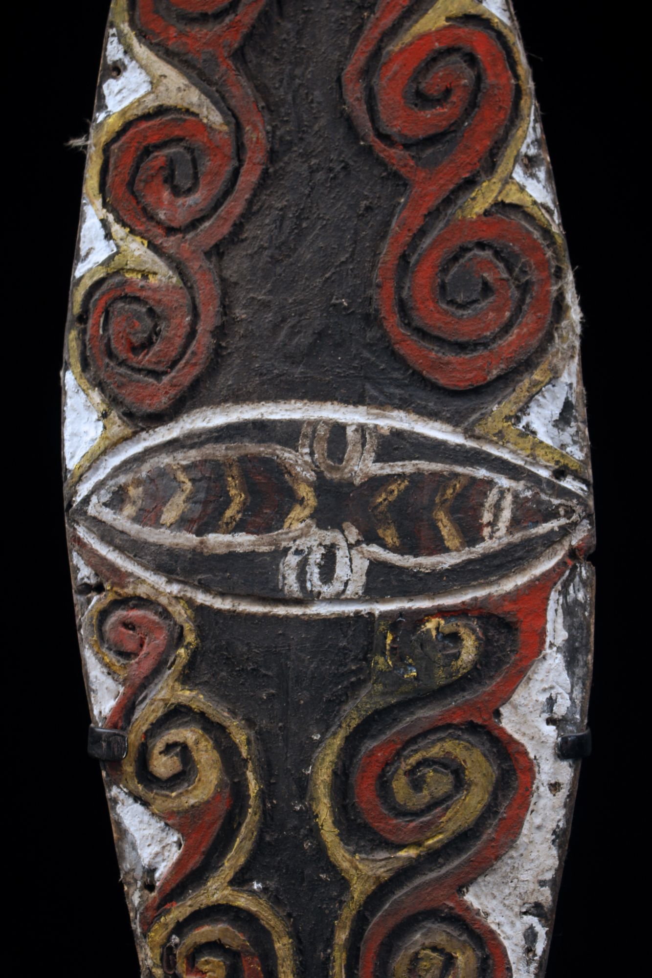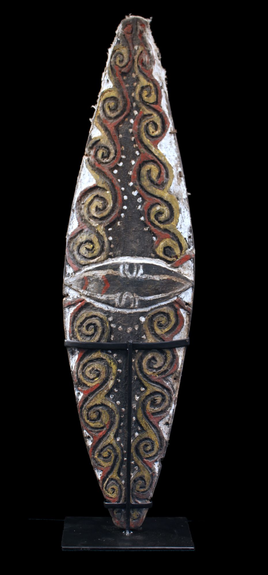 Planchette de culte biface provenant d'une maison de cérémonies. Ces planches, placées dans la maison des hommes, montrent de très vieux dessins qui sont la représentation abstraite d'éléments naturels (animaux et plantes totémiques, lune, soleil, étoiles, etc.) ou d'ancêtres mythiques. Ce sont de véritables tableaux artistiques dont les symboles sont une écriture à part entière... Bois léger pour s'animer au vent (preuve symbolique que tout objet, plante, animal a bien une âme), reste de plumes, pigments naturels et peintures. Vendue avec un socle de présentation.