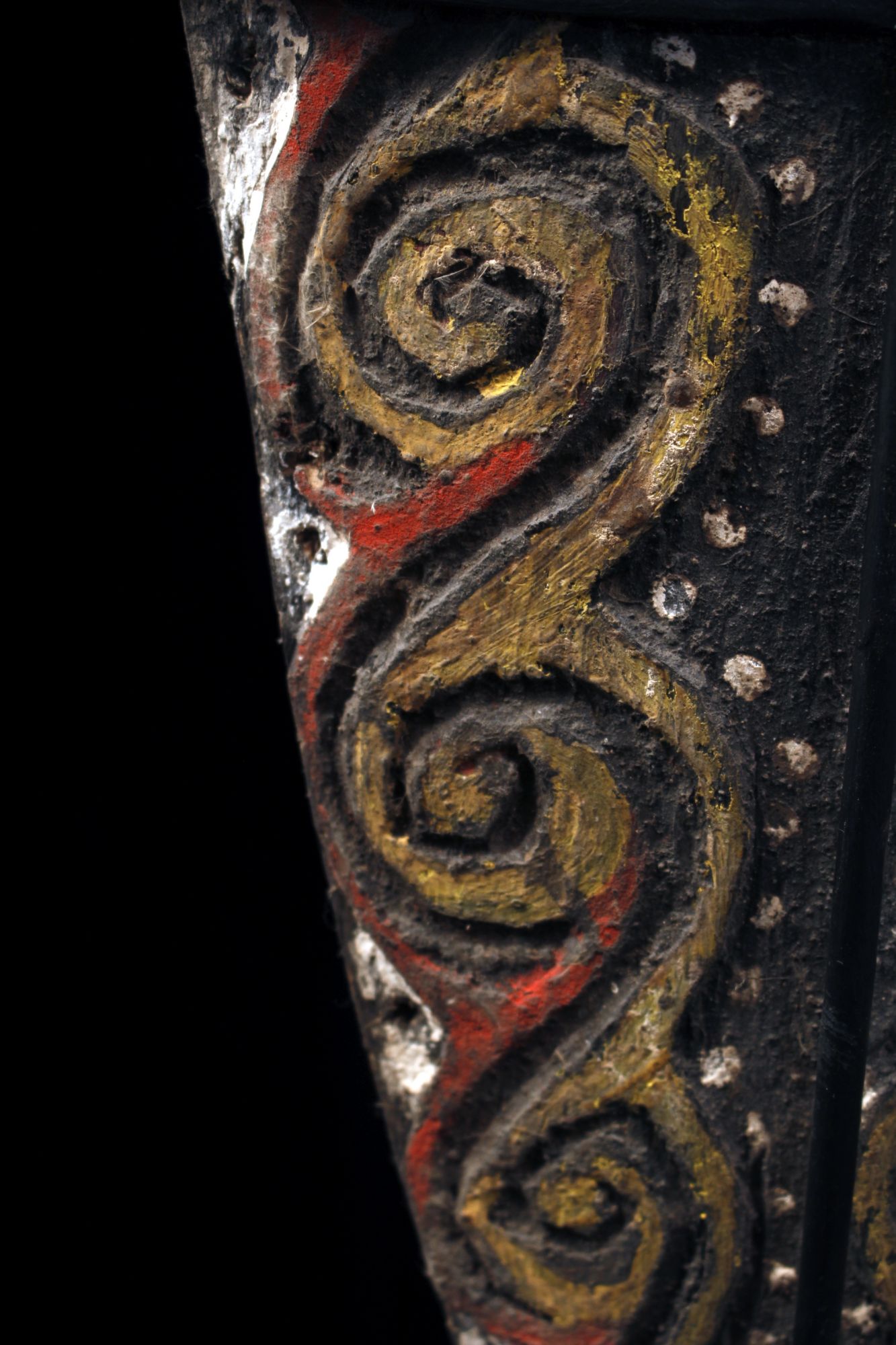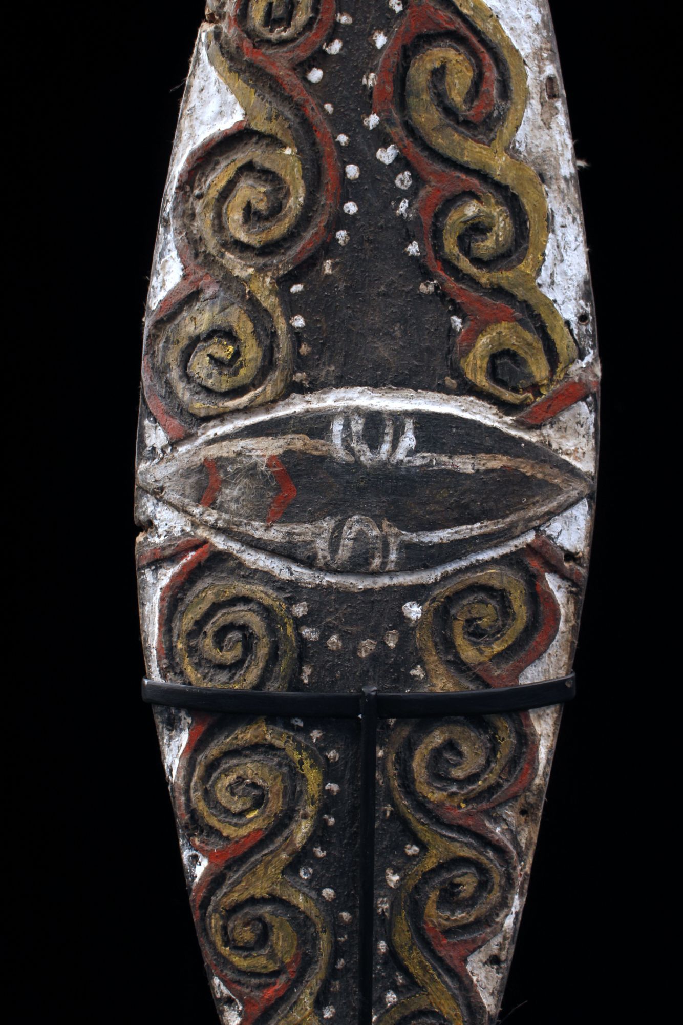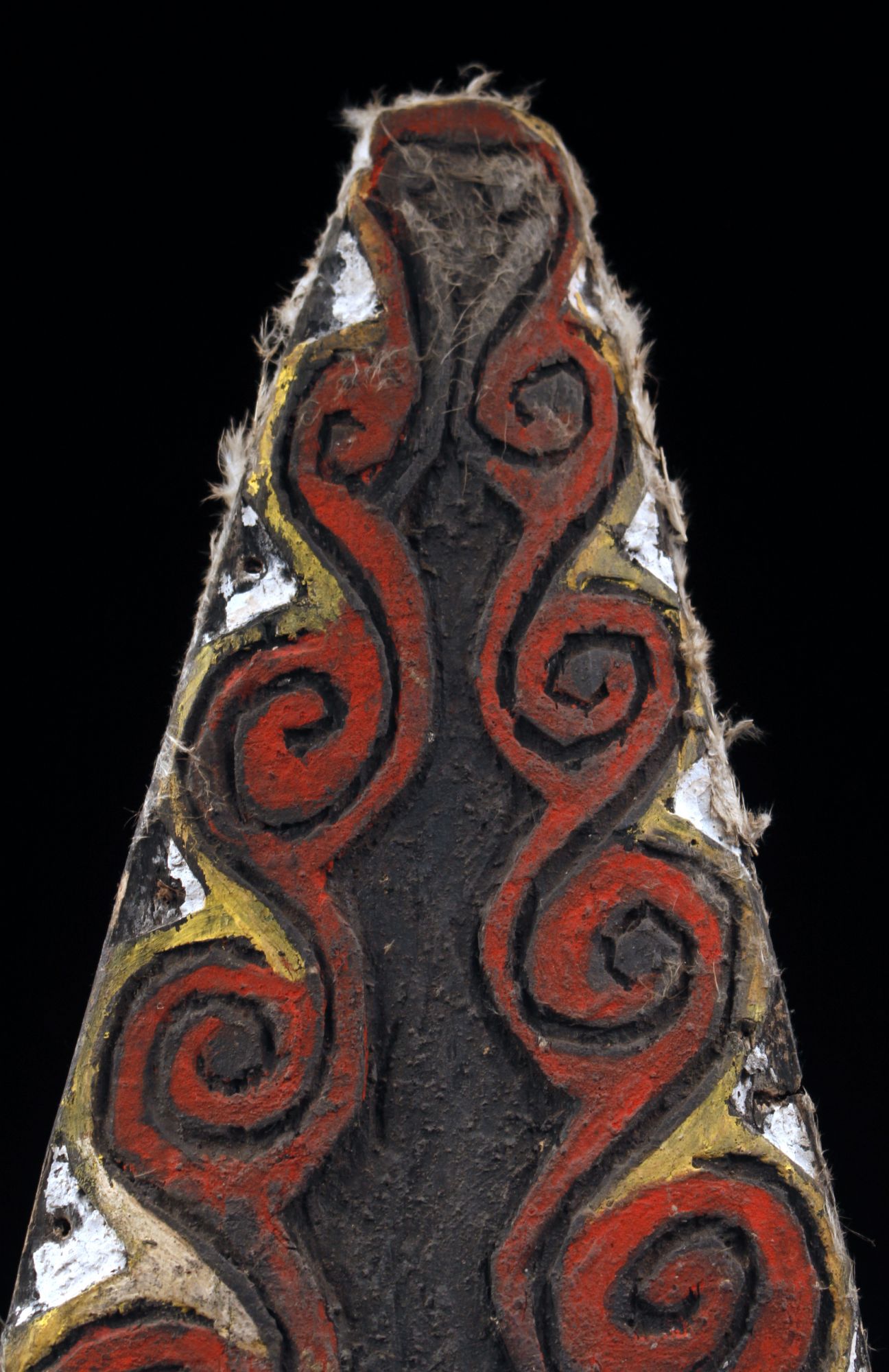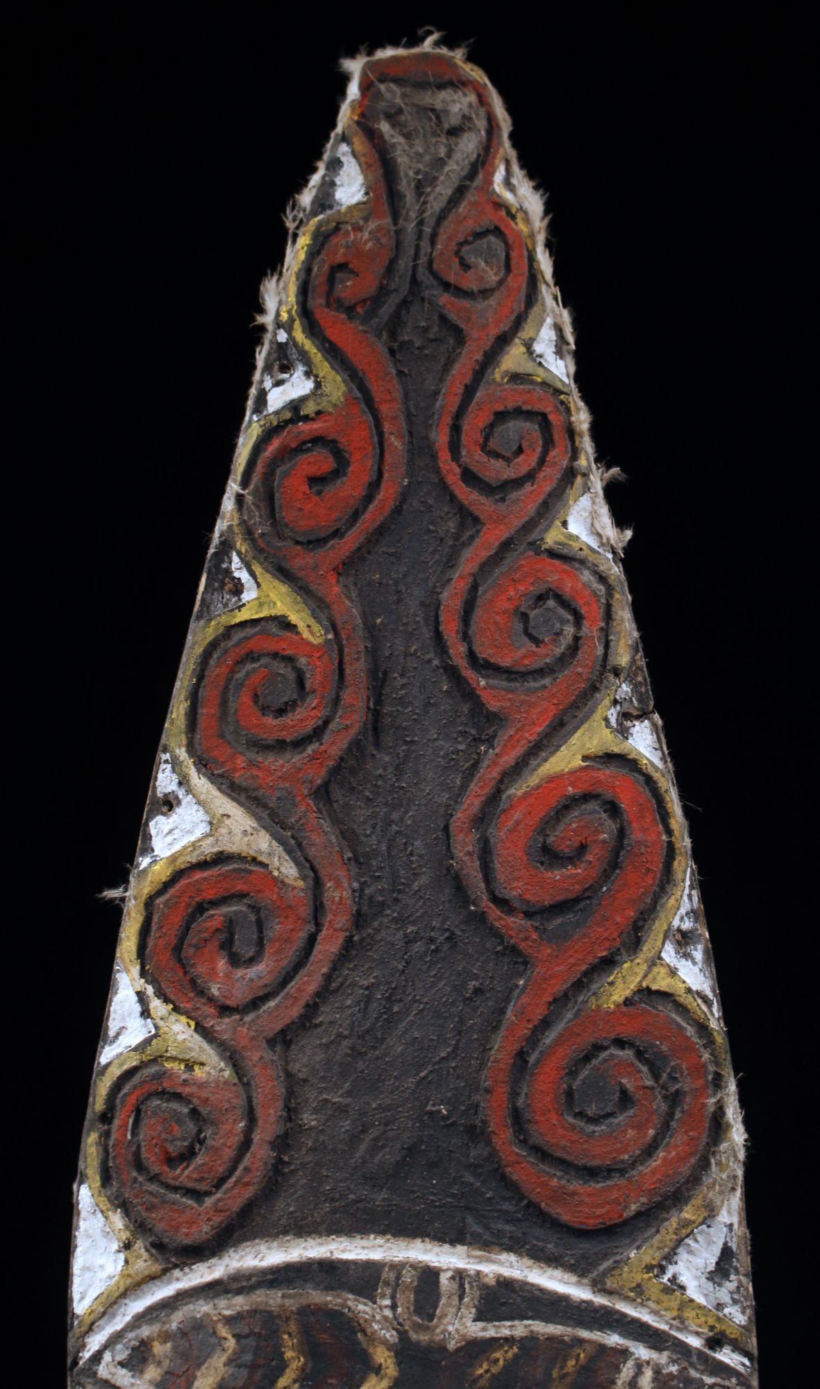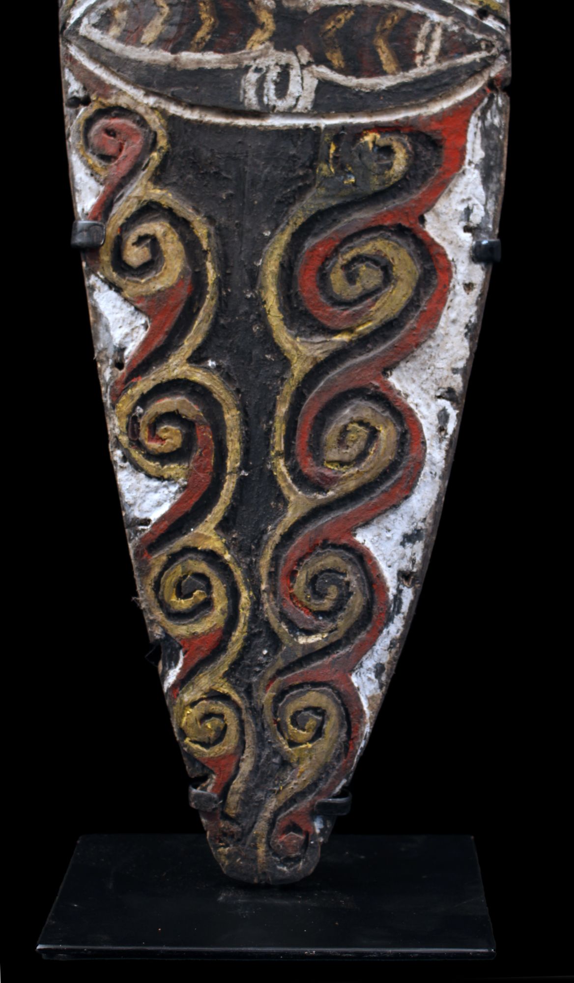 Planchette de culte biface provenant d'une maison de cérémonies. Ces planches, placées dans la maison des hommes, montrent de très vieux dessins qui sont la représentation abstraite d'éléments naturels (animaux et plantes totémiques, lune, soleil, étoiles, etc.) ou d'ancêtres mythiques. Ce sont de véritables tableaux artistiques dont les symboles sont une écriture à part entière... Bois léger pour s'animer au vent (preuve symbolique que tout objet, plante, animal a bien une âme), reste de plumes, pigments naturels et peintures. Vendue avec un socle de présentation.