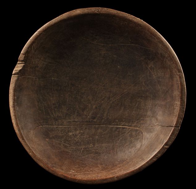 Rare plat en bois présentant une très belle patine d'usage. Ce type de plat, maintenant remplacé par des écuelles en émail, servait de plat culinaire, notamment lors des partages de nourriture organisés lors de certaines cérémonies traditionelles. Décoré et avec une attache pour être suspendu dans la case et gravé du nom de son ancien propriétaire. Traces d'usage.