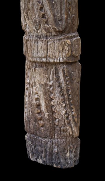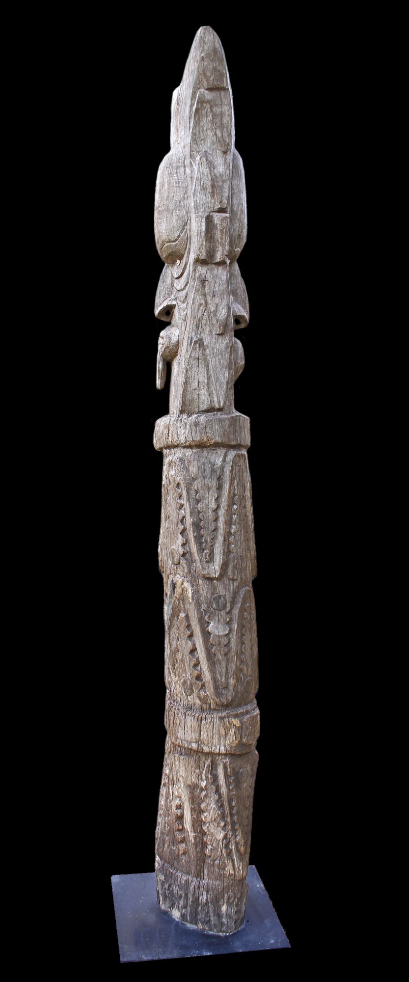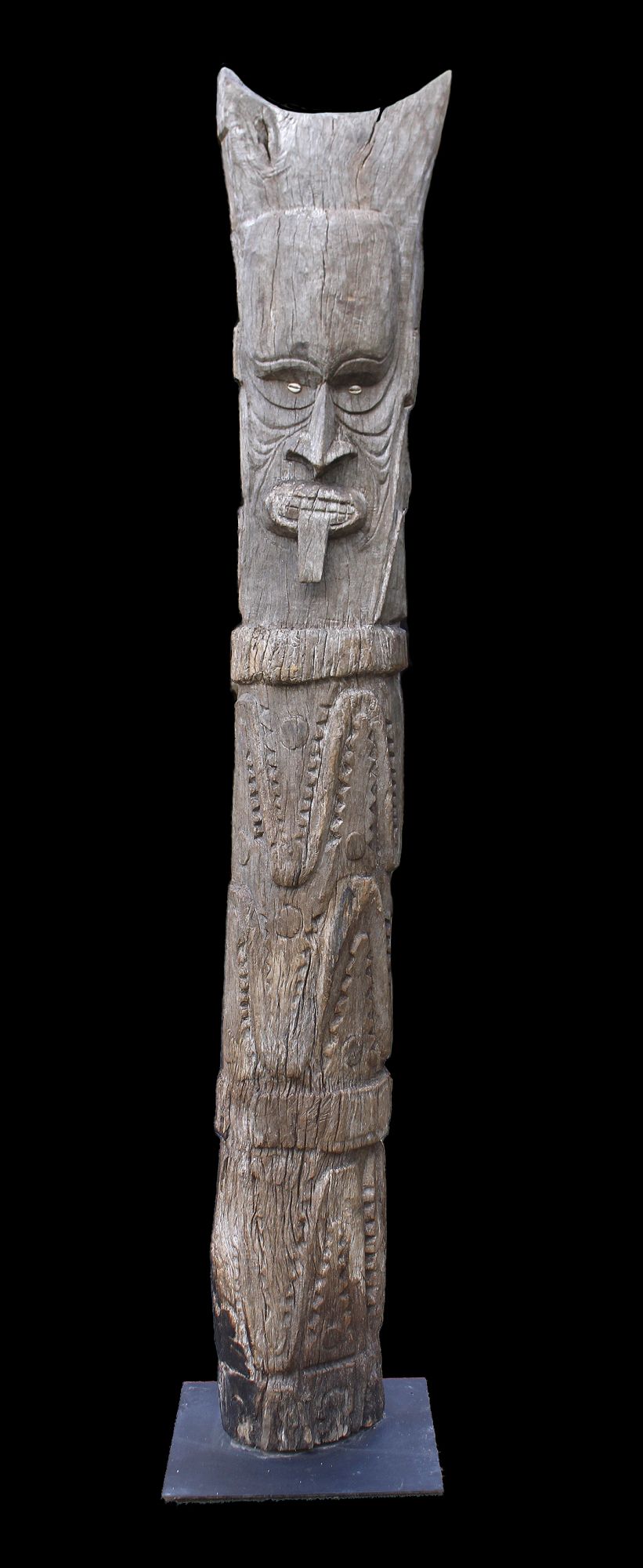 Ancien poteau de case. Ce poteau a été un élément porteur d'une case de cérémonie. Toutes les cases de la vallée de fleuve Sépik sont construites sur pilotis en prévision des crues annuelles. Bois erodé par le temps et l'usage. Les cases de cérémonies sont régulièrement reconstruites. Les poteaux, plus résistants que les matériaux légers constituant le toit, les parois et les planchers peuvent être réutilisés. Cependant, dans le cas où ces cases sont définitivement abandonnées, il est possible de les acquérir, ce que j'ai fait pour ce spécimen. Chaque poteau ou poutre est sculpté par un des clans du village qui y représente ses ancêtres et animaux totémiques. Bon état général. Vendu monté sur socle.