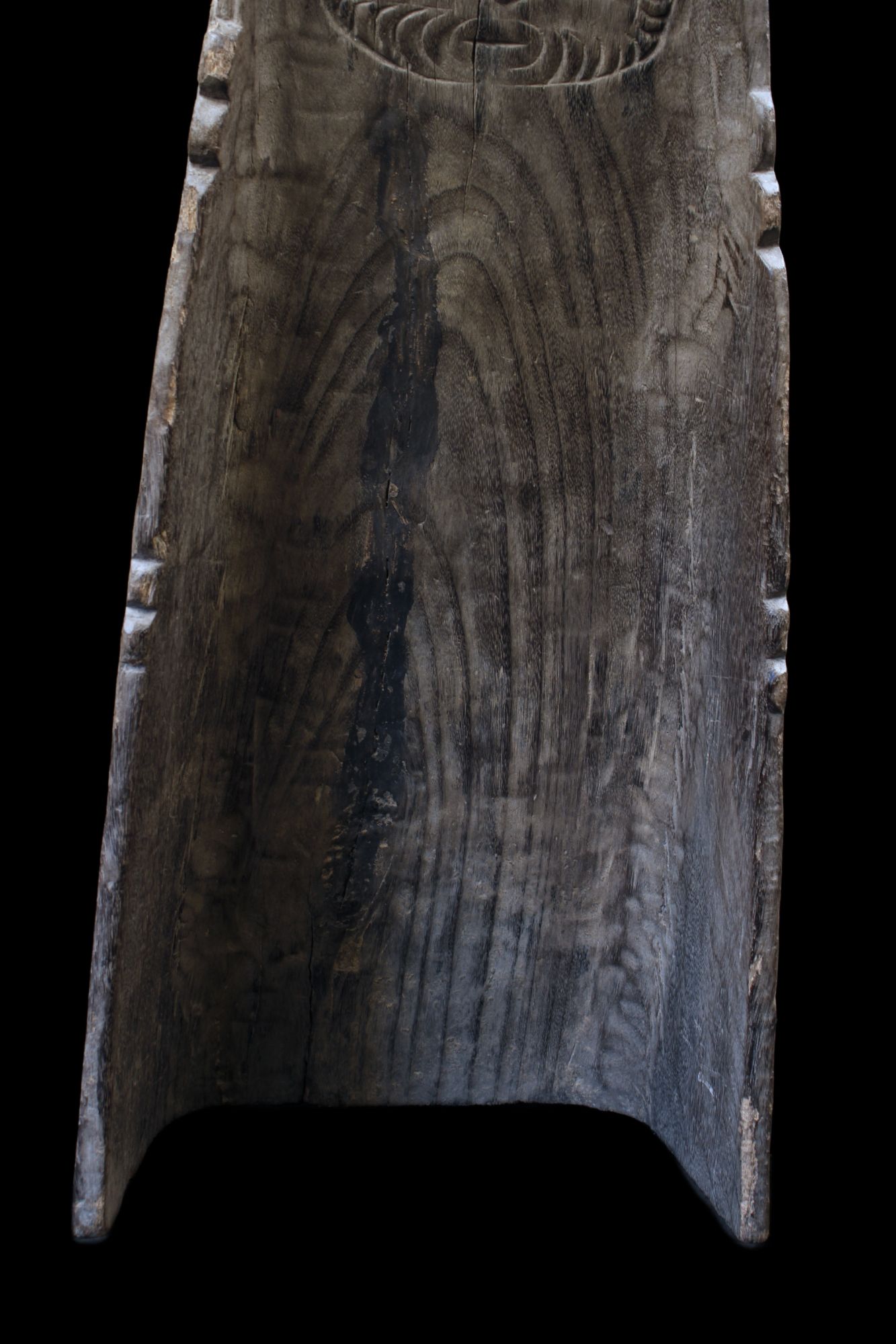 Beautiful canoe prow in the shape of a crocodile head, entirely engraved with tribal drawings typical of the Iatmul area in Papua New Guinea. Today, canoeing remains the most common means of transport in the Sepik River valley. Most of these canoes used in the lower and middle Sepik regions have a carved prow representing a crocodile head, a feared and revered animal. Wood with traces of use.