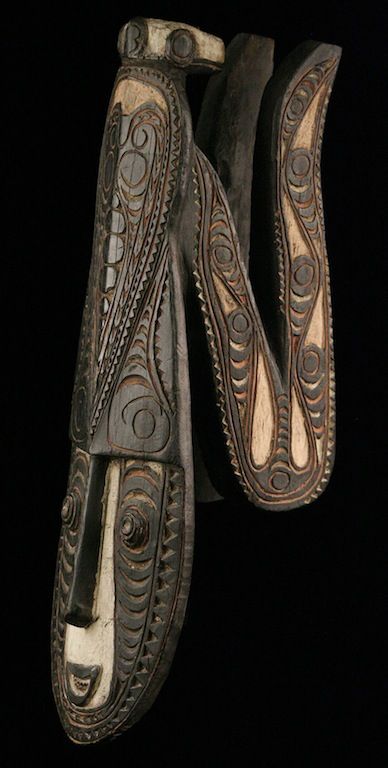 Interesting papuan carving representing a pray mantis, one of a famous totemic animal of Swagup village. Entirely decorated with traditional patterns. Hard wood and natural pigments.