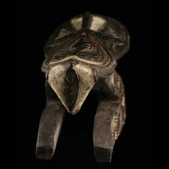 Etonnante sculpture représentant une mante religieuse, animal totémique de prédilection du village de Swagup. Les habitants de ce village sont reconnus pour être de redoutables guerriers. Cette sculpture, entièrement décorée de dessins tribaux sculptés en léger relief, présente un visage stylisé au niveau des ailes de l'insecte. Bois dense et pigments naturels.