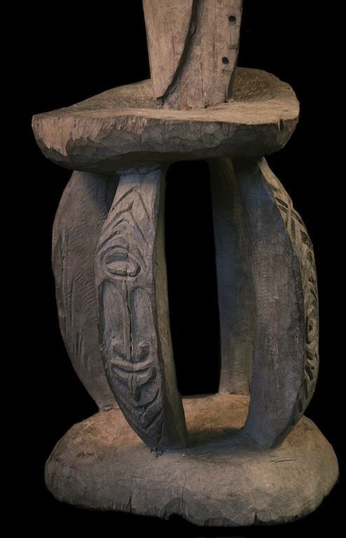 Ancien siège d'orateur en bois dense sculpté dans la masse, d'un seul tenant. Ce type de sculpture est une pièce centrale dans la maison des hommes. Le siège d'orateur a la même fonction que l'arbre à palabres. Toute discussion ou débat sérieux se déroule autour de cette sculpture qui symbolise l'ancêtre sacré et sage du clan. Témoignage poignant de la culture papoue. Très belle pièce d'art tribal avec une extrème présence. Tortue gravée à l'arrière. Bois dense et coquillages.