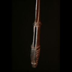 Ancienne spatule à chaux de l'aire Massim. Ces spatules avaient plusieurs fonctions. La première ,usuelle, consistait à l'utiliser comme une cuillère pour porter à la bouche la chaux que l'on consommait avec les noix de betel. Les autres , rituelles, dépendaient du travail de sculpture de chaque spatule. Elle devenaient alors des objets de prestige ou d'échange (lors du rite du kula par exemple). La particularité de celle-ci est d'être à clapper. Le manche est en effet divisé en deux ce qui en fait un instrument de percussion pour accompagner des danses ou des chants.
