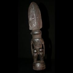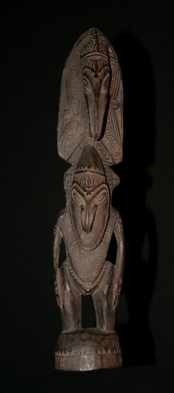 Ravissante statuette en bois patiné collectée dans la région des Murik lakes en papouasie Nouvelle Guinée. Représentation d'un personnage mythique. Evocation du monde spirituel avec la présence d'un oiseau perché sur la coiffe monumentale de l'ancêtre. Statuette très finement travaillée. Patine d'usage.