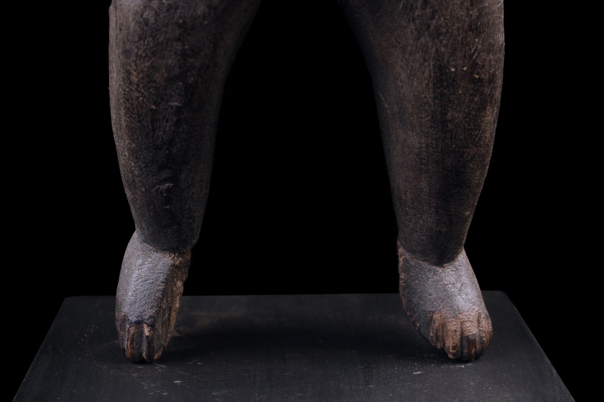 Figure en bois collectée sur la côte nord de la Papouasie Nouvelle Guinée. Représentation d'un ancêtre masculin présentant un visage zooanthropomorphe mi homme / mi oiseau . Bois noirci. Traces d'usage. Pièce unique vendue avec un socle de présentation.