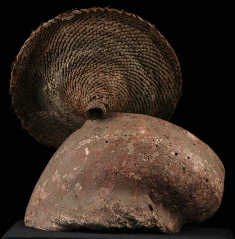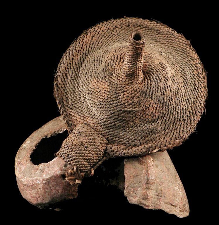 Old talipun currency. The people of Yangoru village manufacture masks of wickerwork and attach them to the shells of giant "Turbo marmoratus" snails, which they purchase from the coastal tribes. The complete object is then kept and used by the Yangoru or traded to the Iatmul, who use these strange, composite works of art as bride prices. Boiken area.