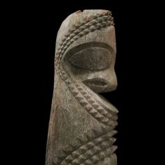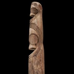 Tambour à fente à deux têtes du Vanuatu. Les tambours à fente de l'île d'Ambrym servent encore de nos jours à communiquer au sein des villages, lesquels ne possèdent pas de distribution électrique. Ces formes majestueuses, typiques de l'île d'Ambrym, font que ces totems tambours sont devenus l'un des symboles forts de cette région du Pacifique Sud. Evoquation de dents recourbées de cochons (symbole de prospérité) sous ce visage stylisé. Sculpture totem pouvant être exposée en extérieur comme en intérieur. Possibilité de soclage pour une exposition en intérieur (100 euros en sus).