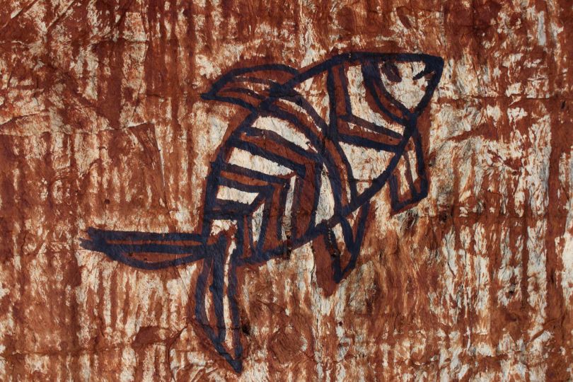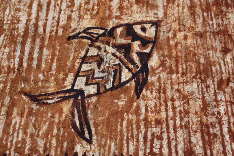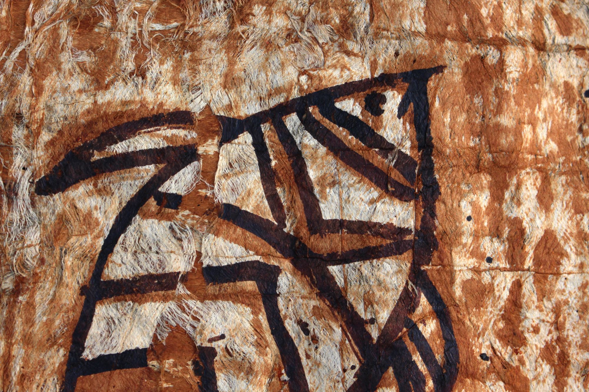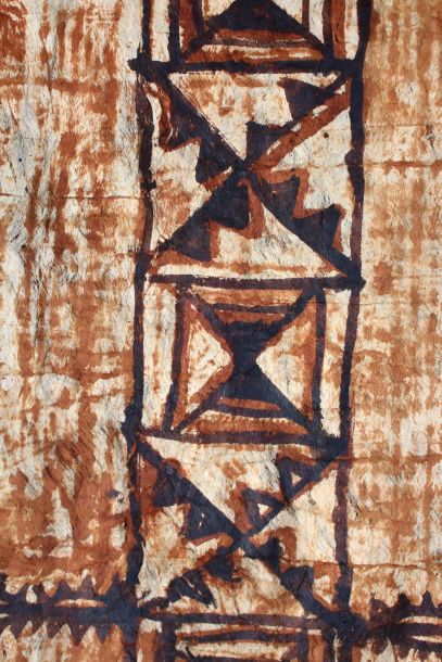 Fragment d'un immense tapa "Ngatu" collecté aux îles Tonga en Polynésie. Le tapa est la première étoffe dont on ait disposé dans le Pacifique. Ses usages étaient variés : vêtements, linceuls, couvertures, moustiquaires, sacs, monnaie de prestige. Les tapas confectionnés aux Tonga sont faits à partir de l'écorce du mûrier à papier. Le liber de l'écorce est extrait et mis à rouir avant d'être battu et seché. L'écorce est frappée à l'aide d'un maillet ou battoir à tapa qui tasse les fibres et les soude entre elles. Les motifs dessinés évoquent de manière abstraite et symbolique des évènements importants, des mythes et légendes ancestraux. En europe, le tapa est à envisager comme une peinture que l'on mettrait au mur. Ecorce battue et pigments naturels à base de racines de palétuviers.