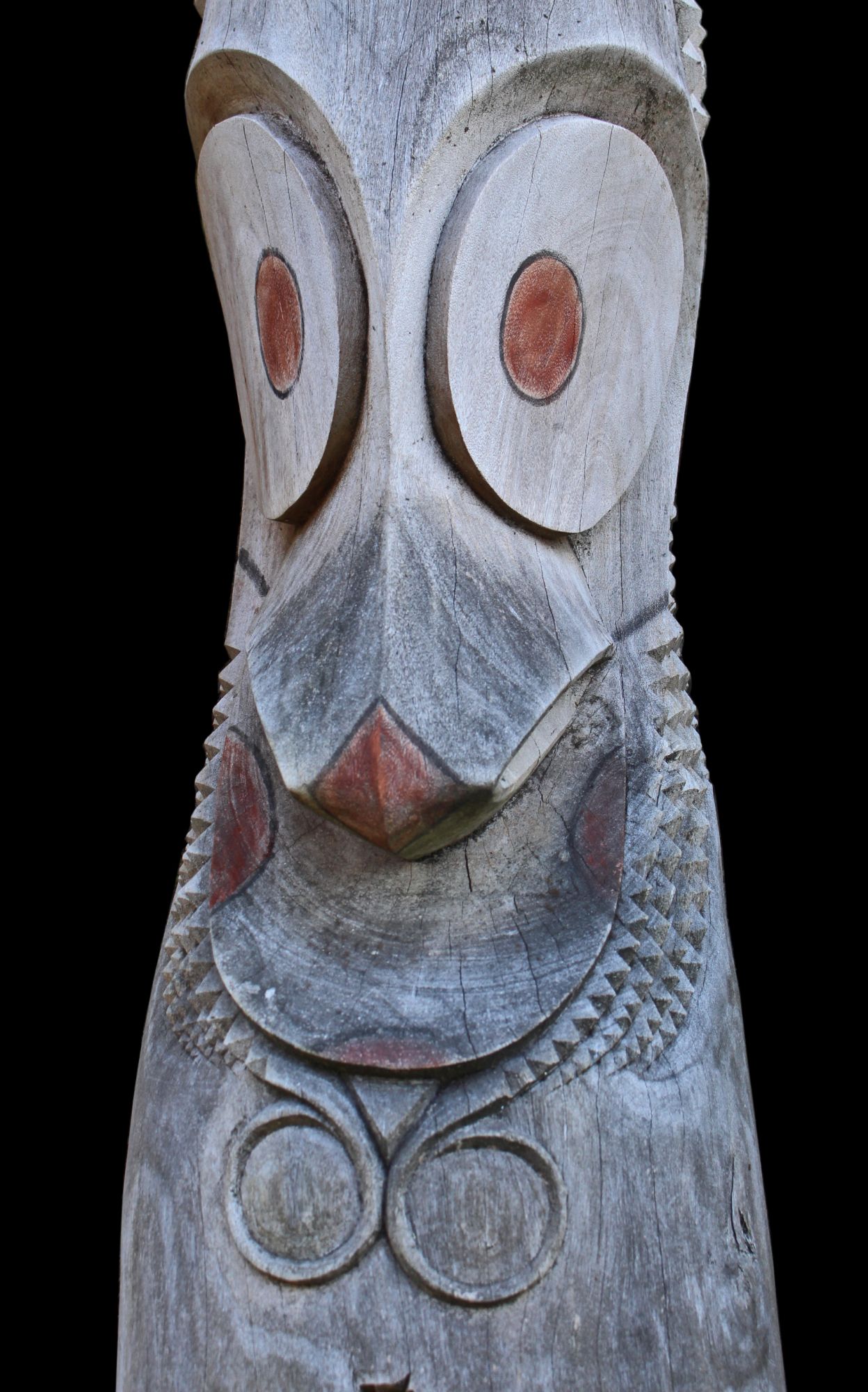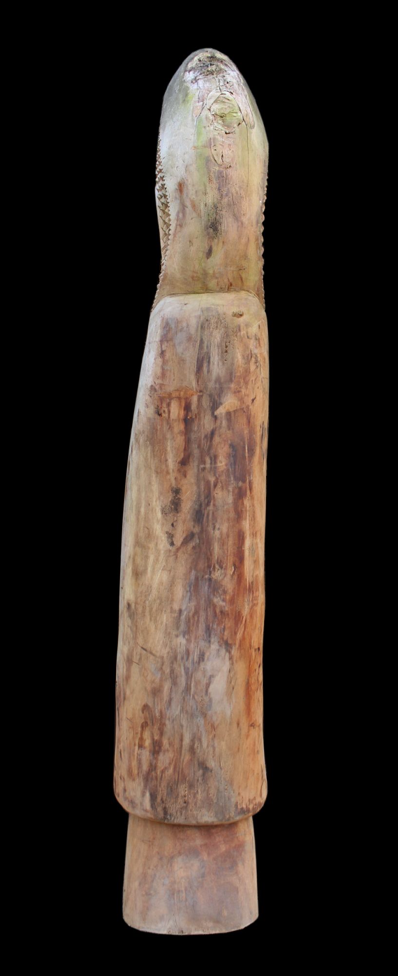 Immense tambour à fente du Vanuatu en arbre à pain. Les tambours à fente de l'île d'Ambrym servent encore de nos jours à communiquer au sein des villages et à rythmer les danses traditionnelles sur la place de danse appelée "Nasara". Ces formes majestueuses, typiques de l'île d'Ambrym, font que ces totems tambours sont devenus l'un des symboles forts de cette région du Pacifique Sud. Evocation de dents recourbées de cochons (symbole de prospérité) sous ce visage stylisé. Sculpture totem pouvant être exposée en extérieur comme en intérieur (voir photos d'exemples). Nous consulter pour une exposition en intérieur pour le soclage.