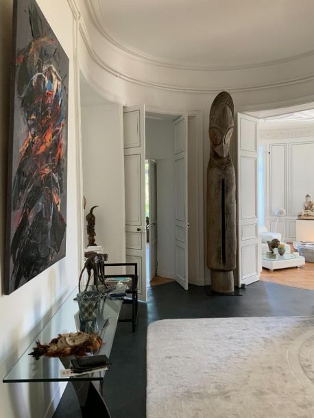 Huge wooden drum collected in Ambrym islands (Vanuatu). The slit drums of the island of Ambrym are still used today to communicate within the villages and to rhythmize the traditional dances on the dance place called "Nasara". These majestic shapes, typical of the island of Ambrym, make these drum totems become one of the strong symbols of this region of the South Pacific. Evocation of curved pig teeth (symbol of prosperity) under this stylized face. Totem sculpture that can be exhibited outdoors as well as indoors (see photos of examples). For more details, please contact us.
