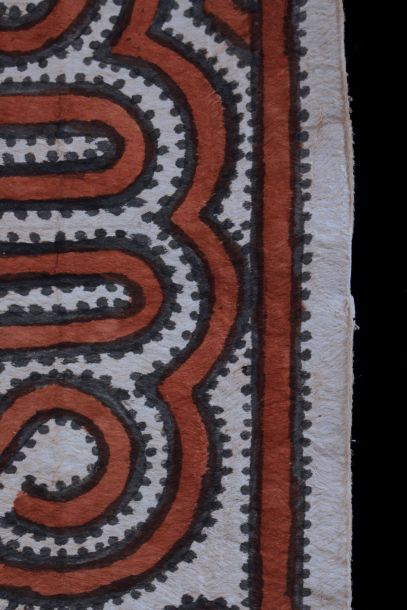 Fragment de jupe de danse en tapa collecté dans la région de Popondetta en Papouasie Nouvelle Guinée. Le tapa est la première étoffe dont on ait disposé dans cette région du monde. Ses usages étaient variés : vêtement, linceul, couverture, moustiquaire, sac, monnaie de prestige pour certaines pièces de grande qualité. Les tapas de la région de Popondetta sont faits à partir de l'écorce du mûrier à papier et servent de jupes de danse. L'écorce est extraite, humidifiée, battue, sèchée. Le fait de la battre tasse les fibres et les soude entre elles. Selon le type de battage, l'épaisseur, la texture et la souplesse de l'étoffe varient. Les motifs dessinés évoquent de manière abstraite et symbolique un certain nombre d'événements ou de faits importants. Ecorce battue et pigments naturels. Très beau encadrée entre 2 verres.
