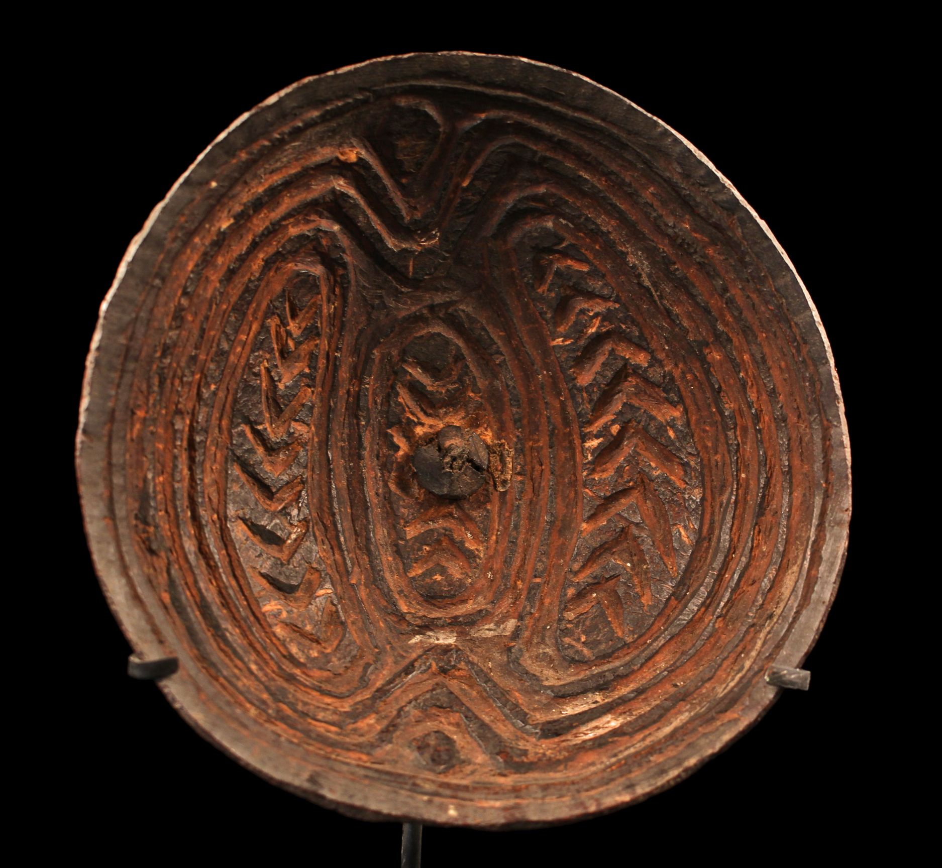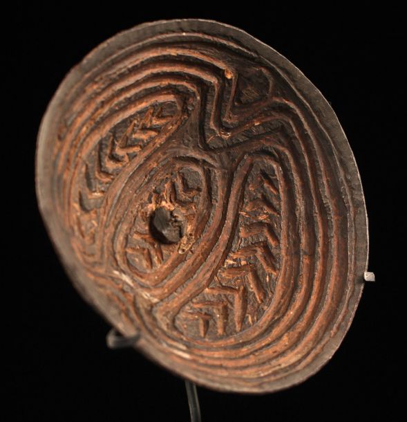 Toupie rituelle en noix de coco et bois, gravée de motifs évoquant des plantes ou animaux totémiques. Traces d'usage. Vendue avec un socle.
