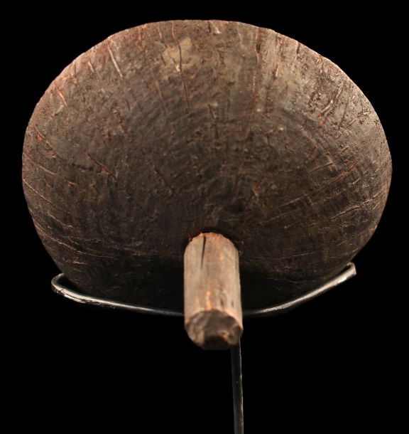 Ritual spinning top made in coconut and wood and decorated with tribal patterns evoquing totemic plants or animals. Used tracks. Sold with a base.