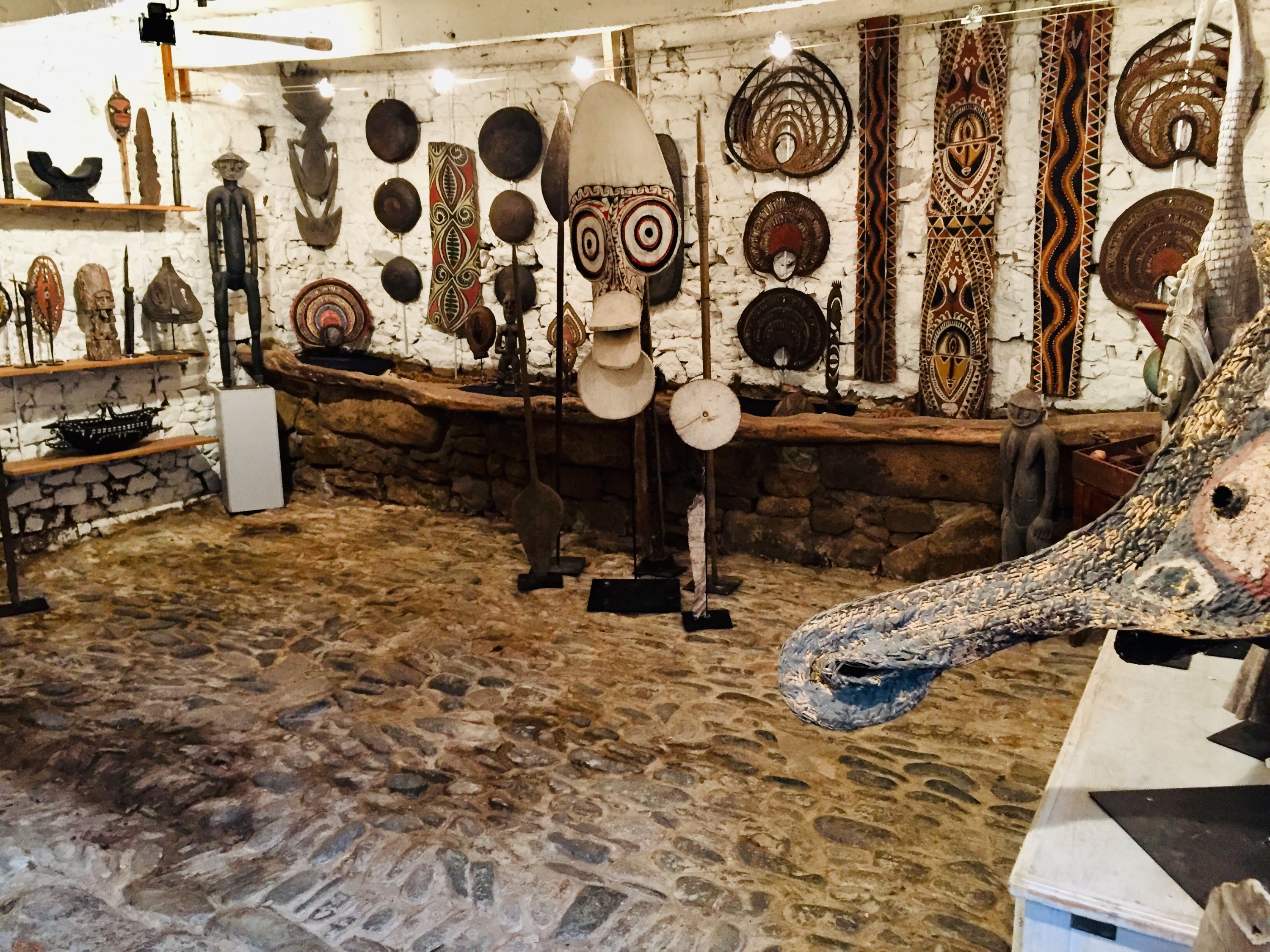 Venez nous voir en Bretagne ! Nous vous attendons pour découvrir notre nouvelle sélection de boucliers, lances, monnaies traditionnelles, masques, statues, tambours... à la galerie "La vieille Cave" dans le centre de Perros-Guirec sur la Côte de Granit Rose.