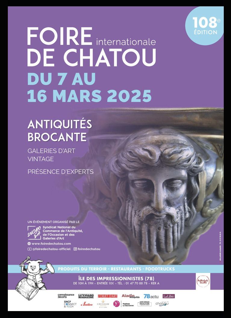 Nous sommes ravis de vous retrouver pour la 108ème édition de la foire de Chatou prévue du 07 au 16 mars 2025. Vous y découvrirez notre nouvelle sélection d'objets sur le stand N°33, allée Pierre Daveau (même emplacement que la dernière édition). Ouvert tous les jours de 10h à 19h avec navette gratuite (passage toutes les 30min) de la gare de RER de Rueil Malmaison. Grand Parking et navette gratuits les Week-end au 41, bd de La République à Chatou.