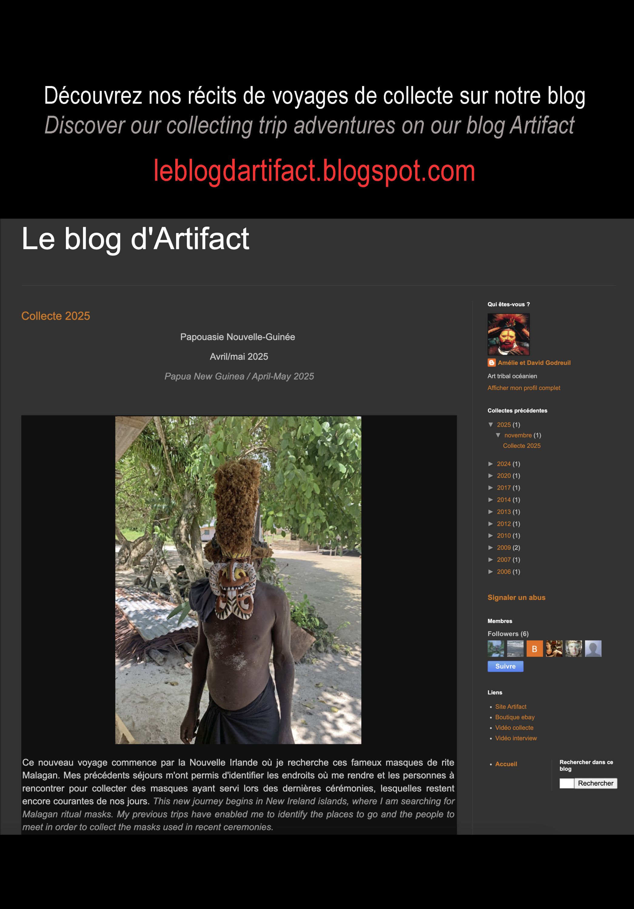 Le récit de notre dernière collecte est maintenant disponible sur notre blog Artifact dont le lien est accessible dans la rubrique "Photos de terrain" de ce site. Des îles de Nouvelle-Irlande aux berges du fleuve Sépik, nous vous invitons à vivre une immersion dans la culture papoue !