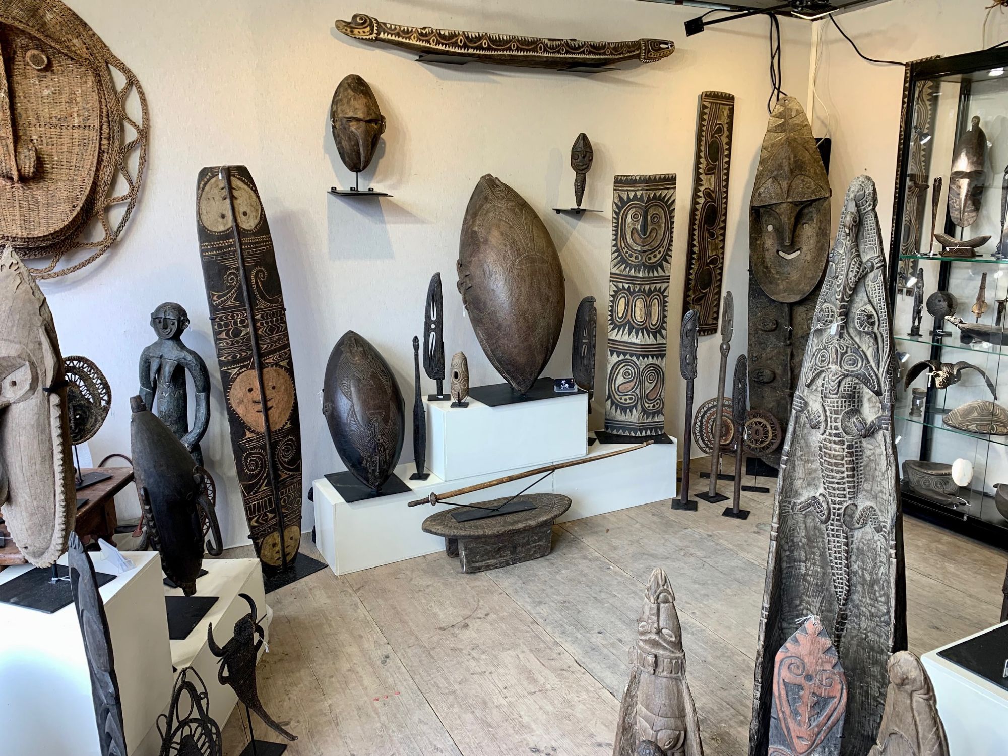 Rare bouclier votif en bois et pigments naturels provenant d'une maison de cérémonies. Ces planches, placées dans la maison des hommes, montrent des dessins qui sont la représentation abstraite d'ancêtres ou d'éléments naturels (animaux et plantes totémiques, lune, soleil, étoiles, etc.). Ce sont de véritables tableaux artistiques dont les symboles sont une écriture à part entière. Vendu avec un socle de présentation.