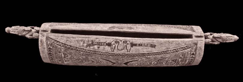 Rare extrémité de tambour à fente de village collecté dans le village de Darapap en Papouasie Nouvelle Guinée (voir type de tambour sur la dernière photo). Sculpture montrant un personnage typique de la région des lacs Murik (embouchure du fleuve Sépik) représentant un ancêtre anthropozoomorphe mi homme mi oiseau. Sculpture ajourée en partie arrière évoquant des plantes et/ou animaux totémiques (mante religieuse ?). Dessins gravés réhaussés de chaux. Pièce unique en bois dense.